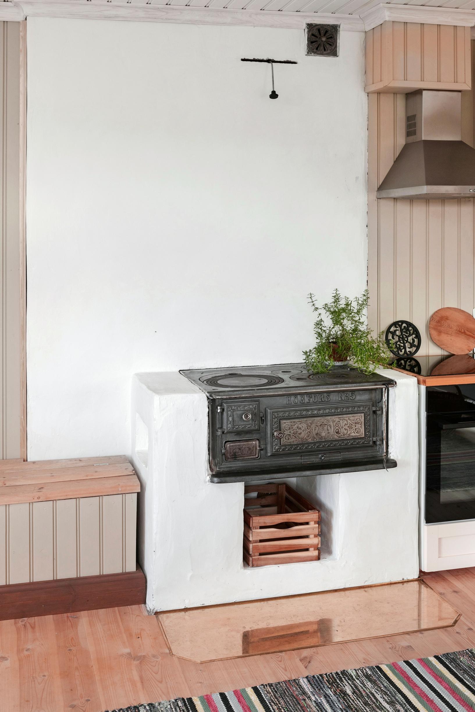 We found the house in a Findit ad in 2019. It was 200 square meters (2,150 square feet) across two floors. The demolition took 2.5 months. We hired a local construction firm, Byggakuten, to dismantle, move, and reassemble the log frame. We saved everything usable: floor moldings, windows, doors, some of the roof tiles, the cylindrical stove, and the stone steps leading up. Some of the floorboards were older than the house itself. We took all of them with us. We even chopped up the original staircase to move it piece by piece. However, the old open porch was completely rotten, so we replaced it with a larger glassed-in veranda here. We also swapped out the wood-burning stove from the kitchen for a more beautiful model.