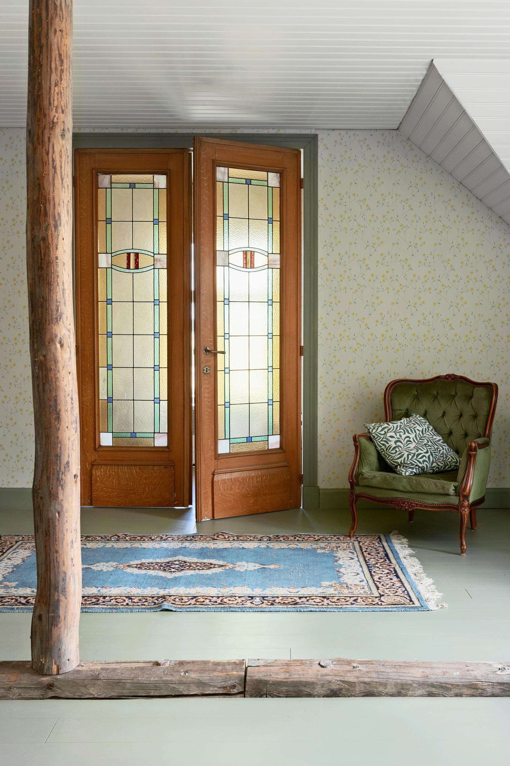 We did all the interior work ourselves with help from our families. We wanted to preserve as much of the original as possible and keep the patina and spirit of the old house alive. We hardly changed the house’s layout. We also didn’t re-paper the walls with backing paper; instead, there’s a breathable board on top of the logs, then we applied wallpaper. The ceiling panels are new, too. The reassembled original staircase creaks just the right way.