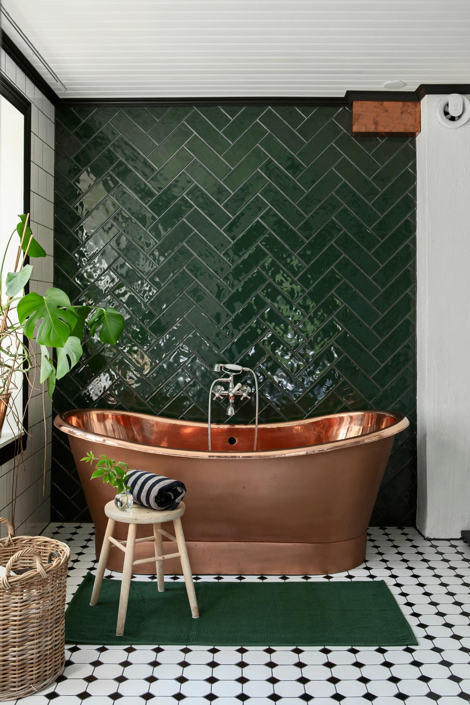 I saw it online at Taloon.com. It was so wild and so expensive that I didn’t even dare to dream about having it. I had planned to invest in beautiful handmade wall tiles for the bathroom. But when the tub went on sale, I crunched the numbers and decided to swap the handmade tiles for more affordable green ones. I believe my brother, who did the tiling, was very pleased with this change—handmade tiles would have been much trickier to install. The tub is still one of my favorite things in our home.