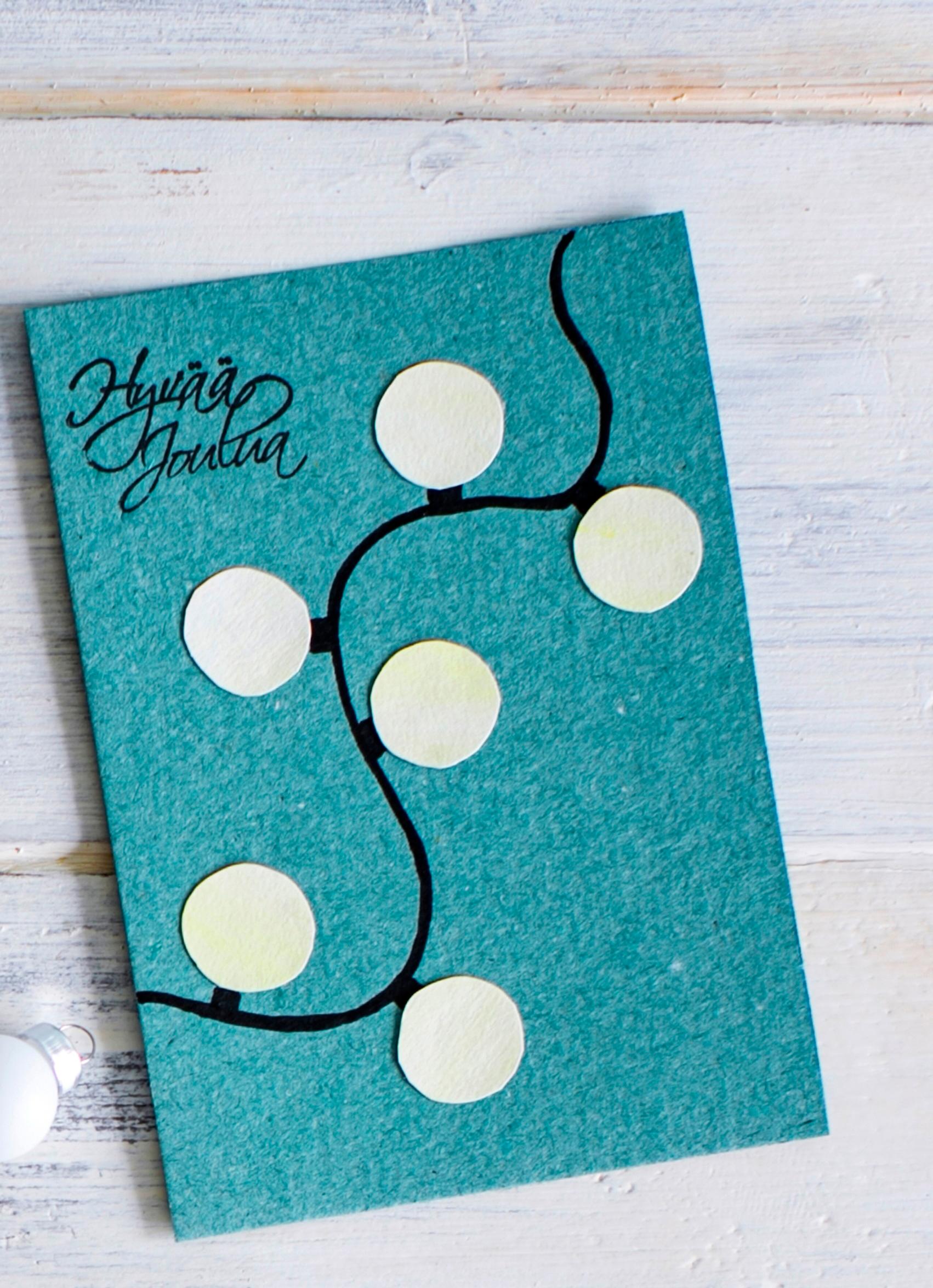 Lightly apply a wash on watercolor paper with yellow watercolor. Cut out Christmas light bulbs from it. Draw the wire and sockets with a pen, then glue the lights in place. An easy alternative is to use round gold stickers from craft stores.