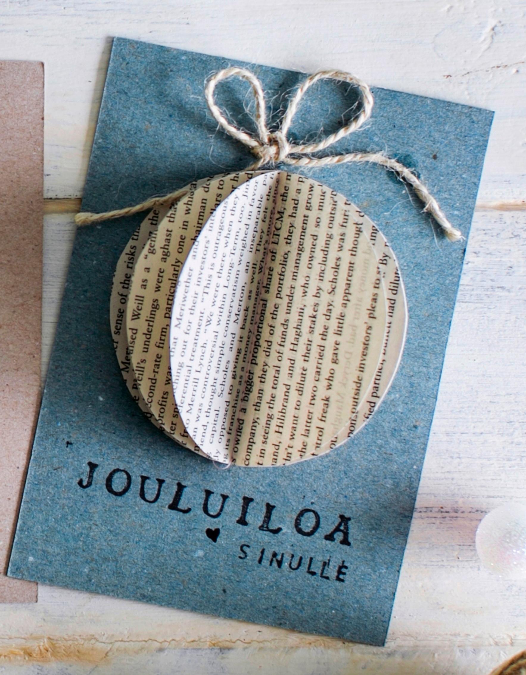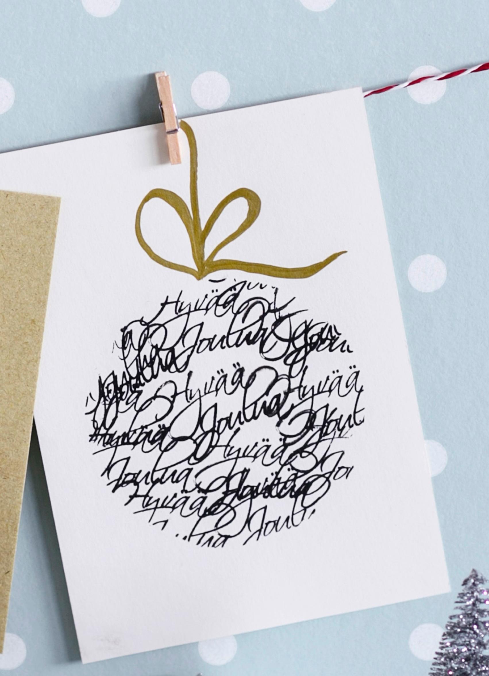 Use a Christmas stamp on a circle stencil cut from cardboard to stamp in the entire opening. Draw a hanging string with a gold pen. Watch this video to see how the card is made. [in Finnish]