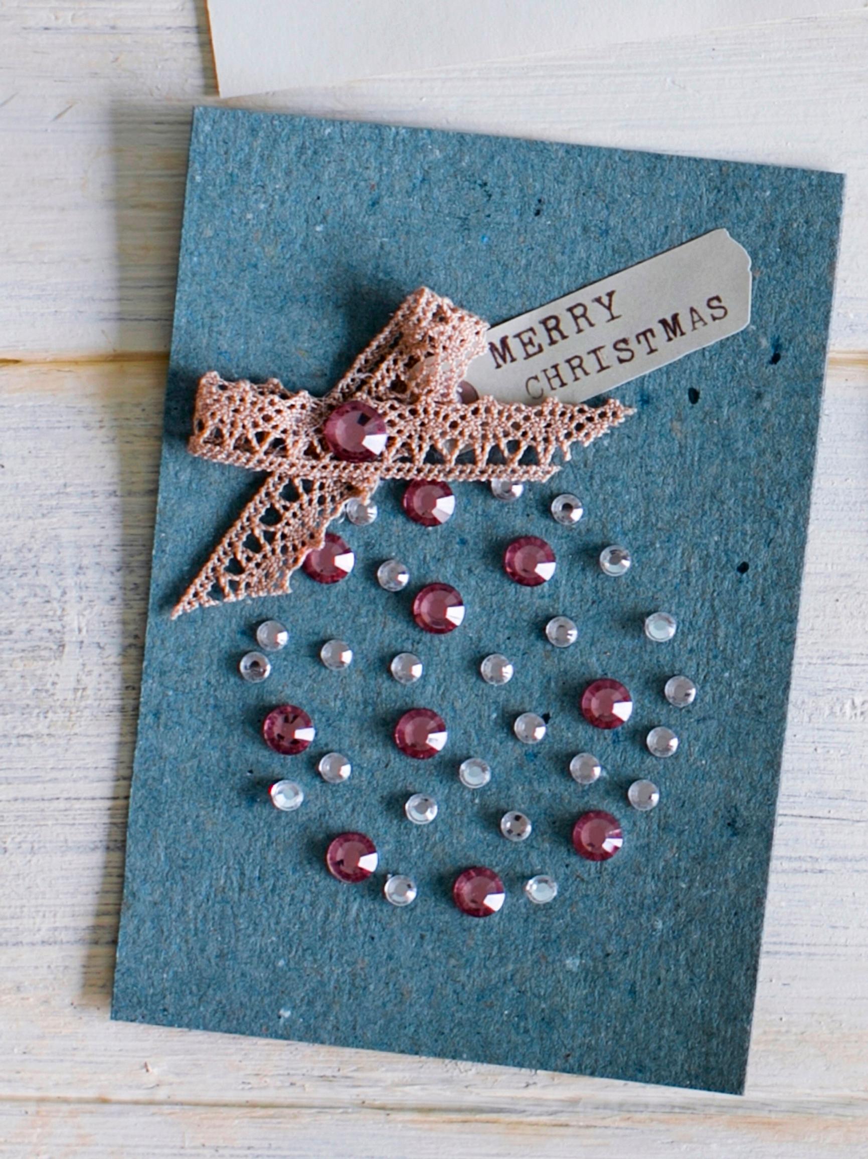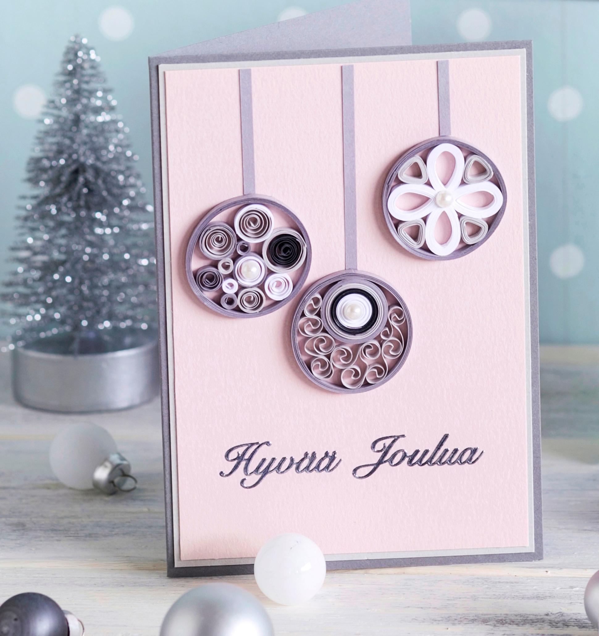Create a ball with diamond stickers. Make a bow from lace ribbon, attach it with hot glue, and finish with a pre-made text sticker. Watch this video to learn how to create the card effortlessly. [in Finnish]