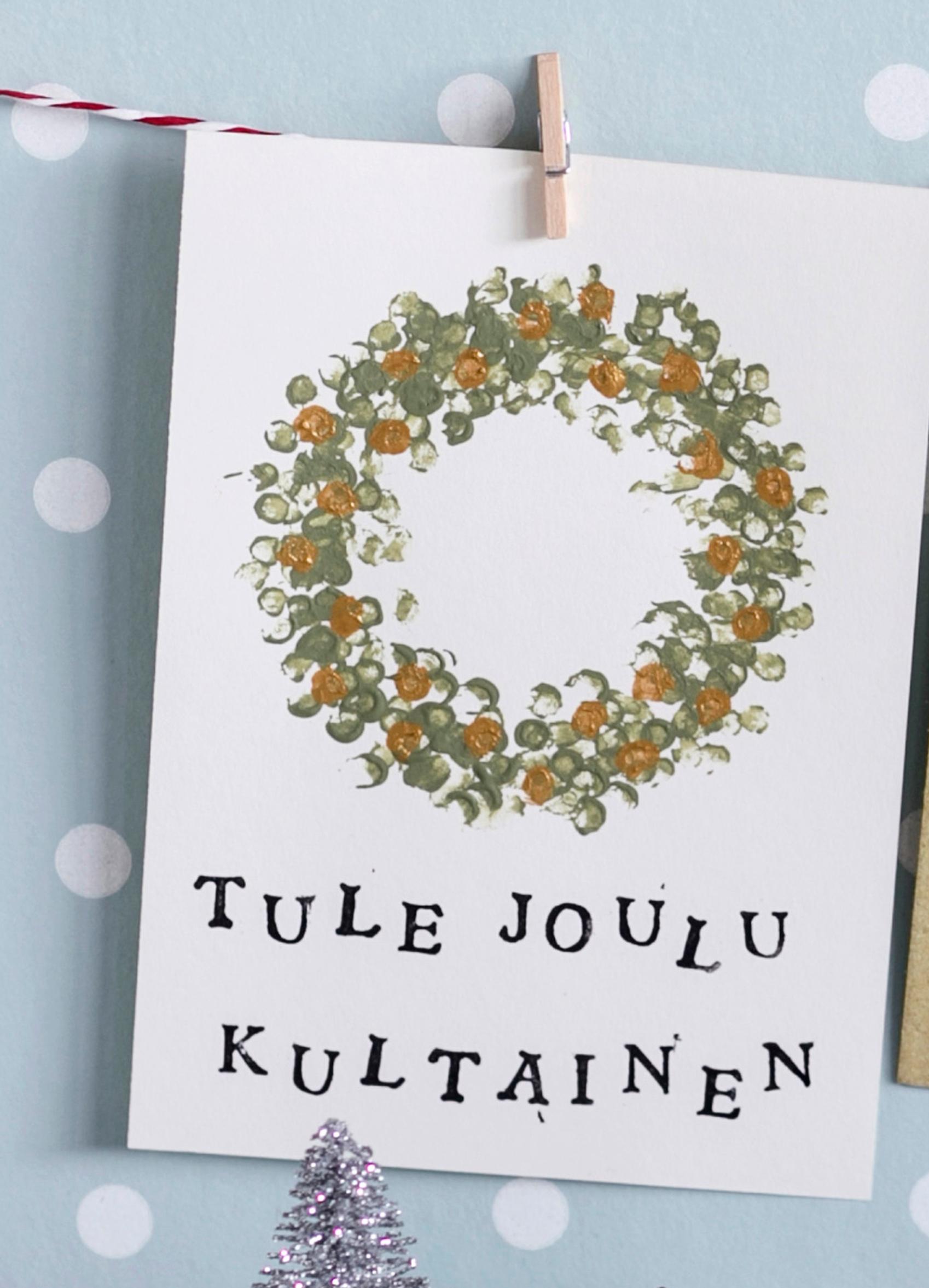 Use a cotton swab and craft paints and dab on a wreath. Start with a green base, let it dry, and then embellish with golden dots. Using individual letter stamps requires practice for a neat finish. Watch this video to learn how to create a Christmas card effortlessly. [in Finnish]