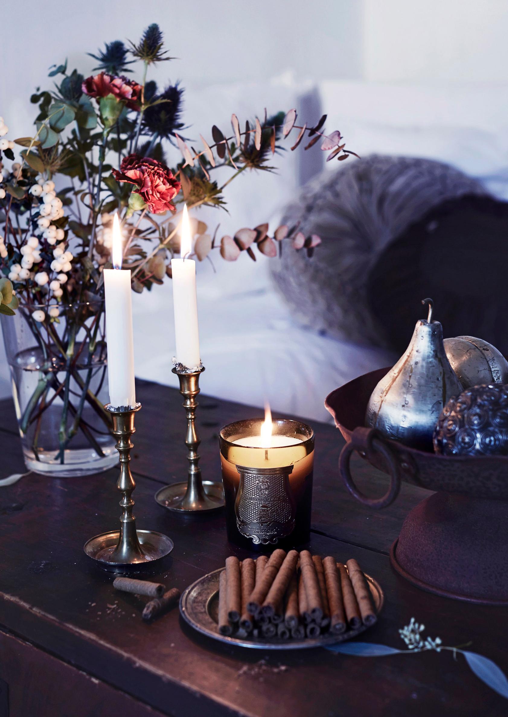 Arrange a festive vignette on the coffee table with your favorite objects. Scents matter just as much as the eye candy. A few cinnamon sticks might even end up flavoring the mulled wine.