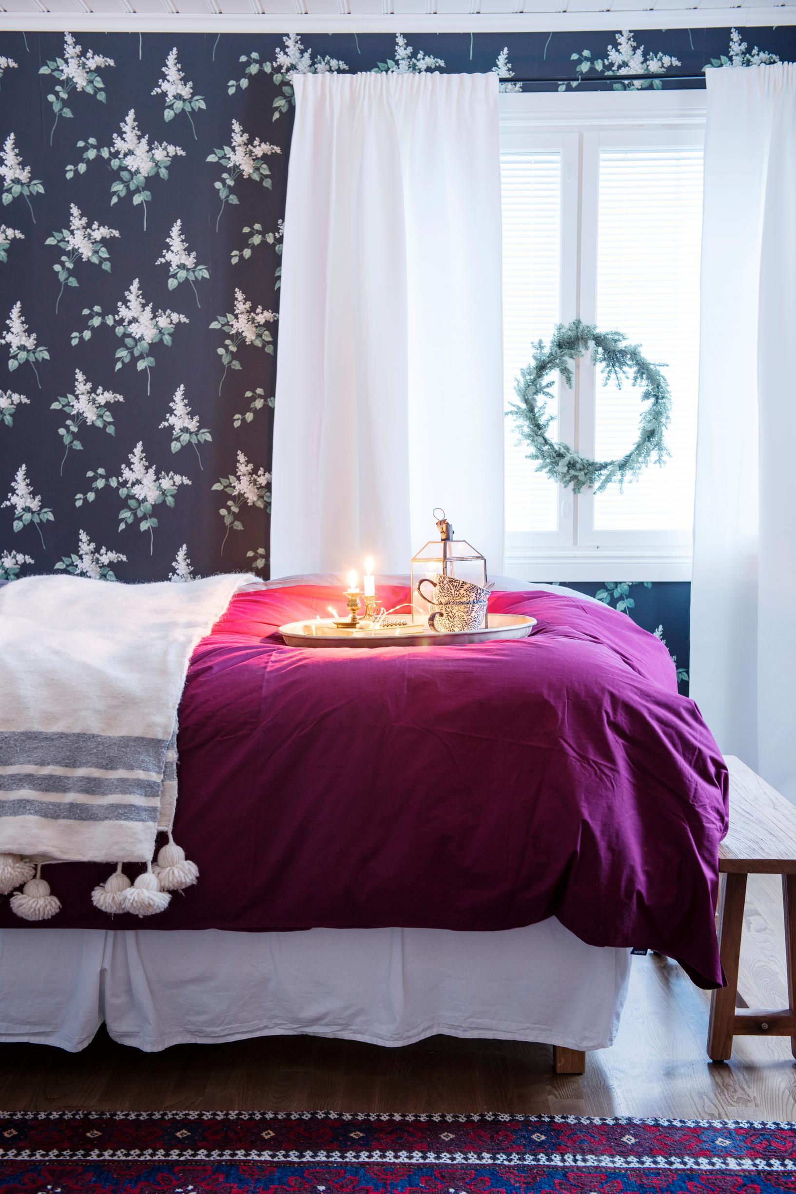 Sweet holiday dreams! Don’t forget to decorate the bedroom, too—a simple wreath in the window sets a festive mood. Modern holiday bedding could be burgundy or deep green.