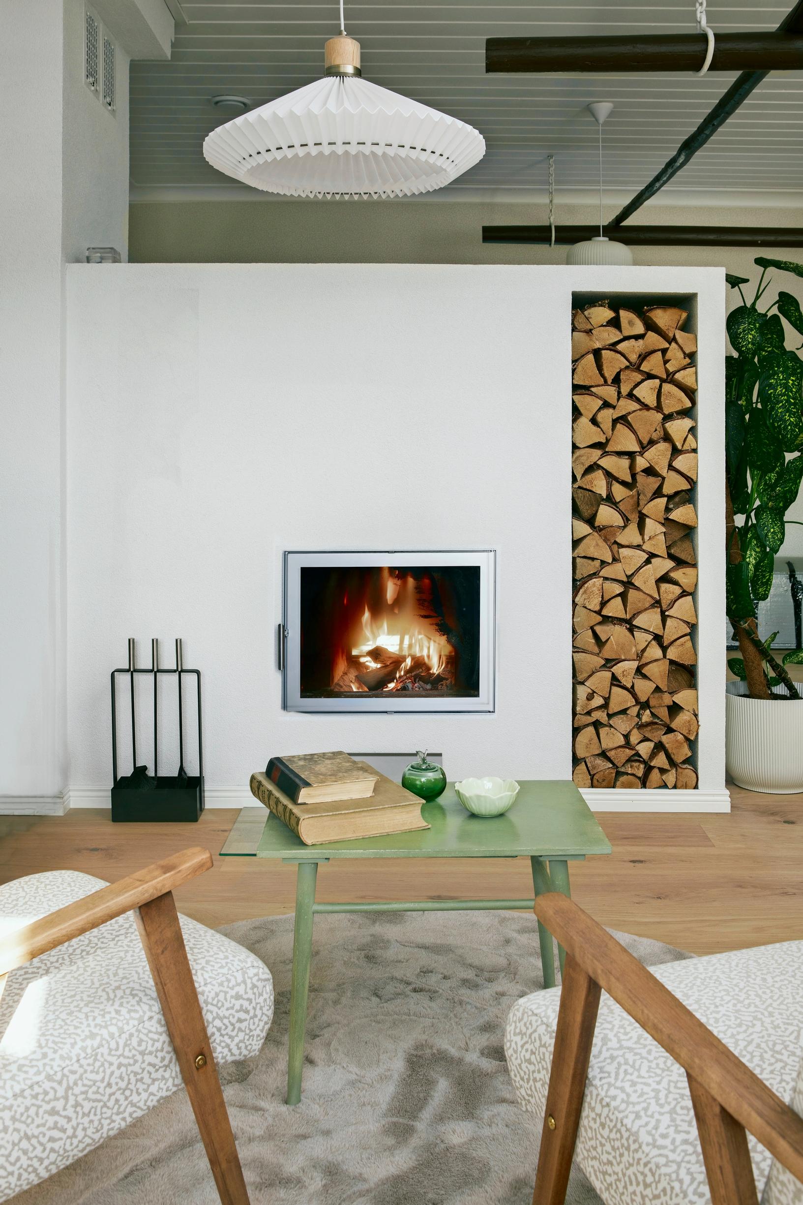 But the result was well worth it. Now, where the oven and tank once stood, there are two reupholstered 1960s armchairs. From this cozy corner, you can enjoy the fire through the glass-fronted fireplace.