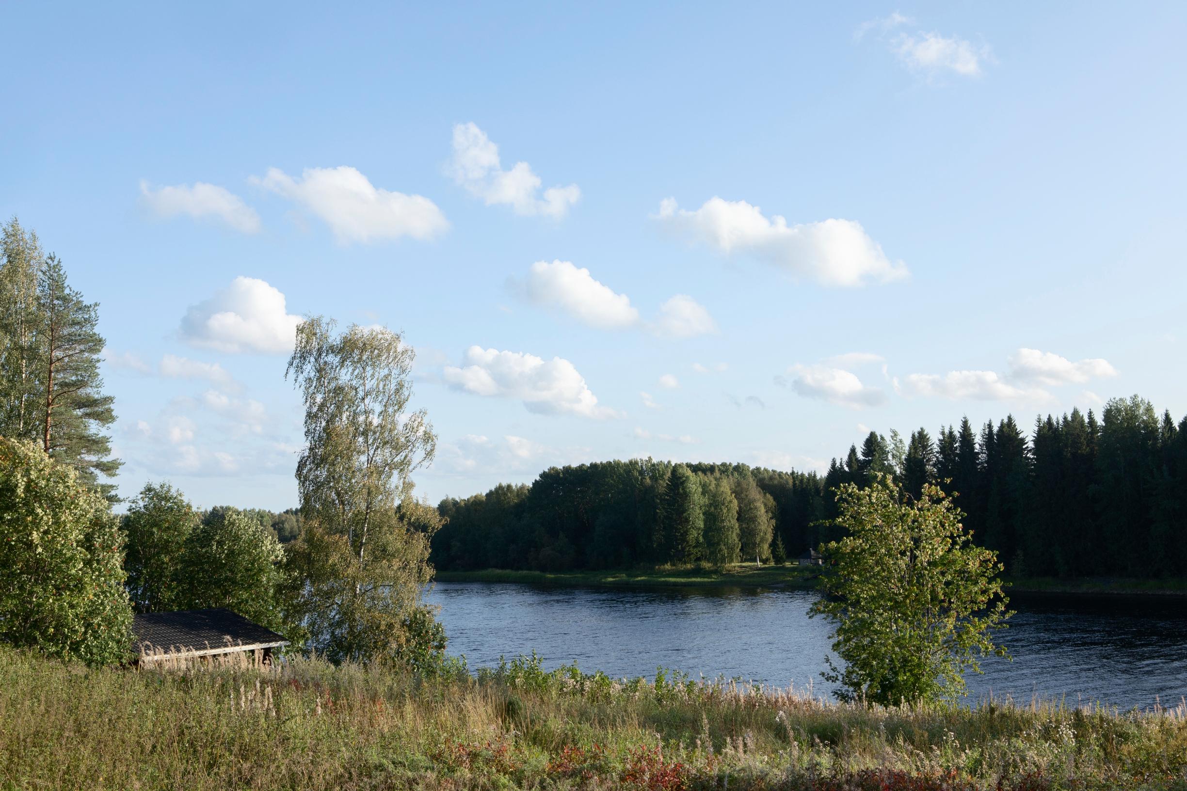 Behind the six-pane windows, the Oulujoki River flows toward the Gulf of Bothnia. It’s about 20 km (12 mi) of scenic country roads to both the coast and Oulu’s center. Tiia Tervaoja sets out coffee on the red-painted table in the pirtti. Tapio sits across from her. The family’s preteen is off exploring. Their dog, Ansa, lounges on the pirtti floor.