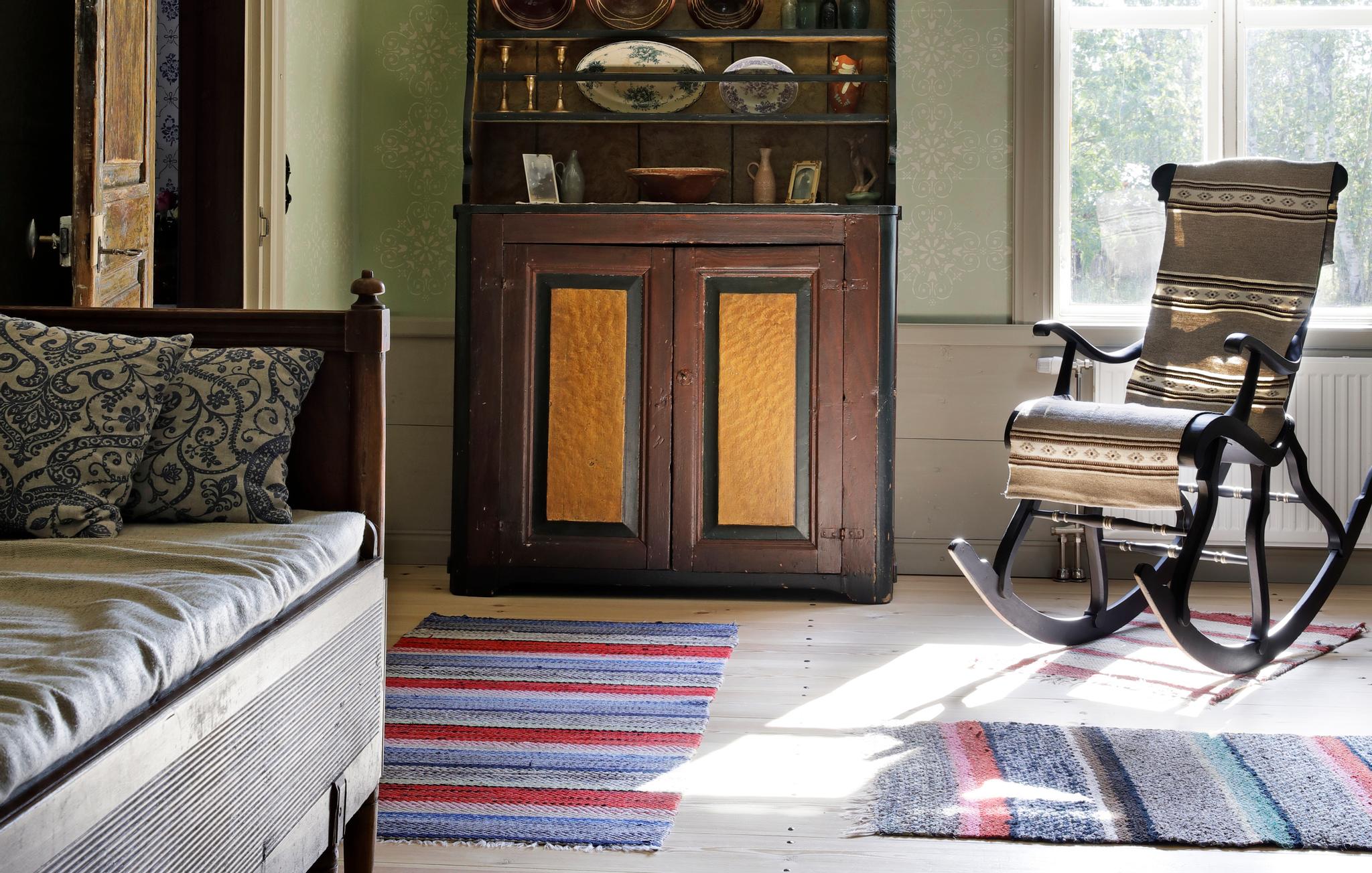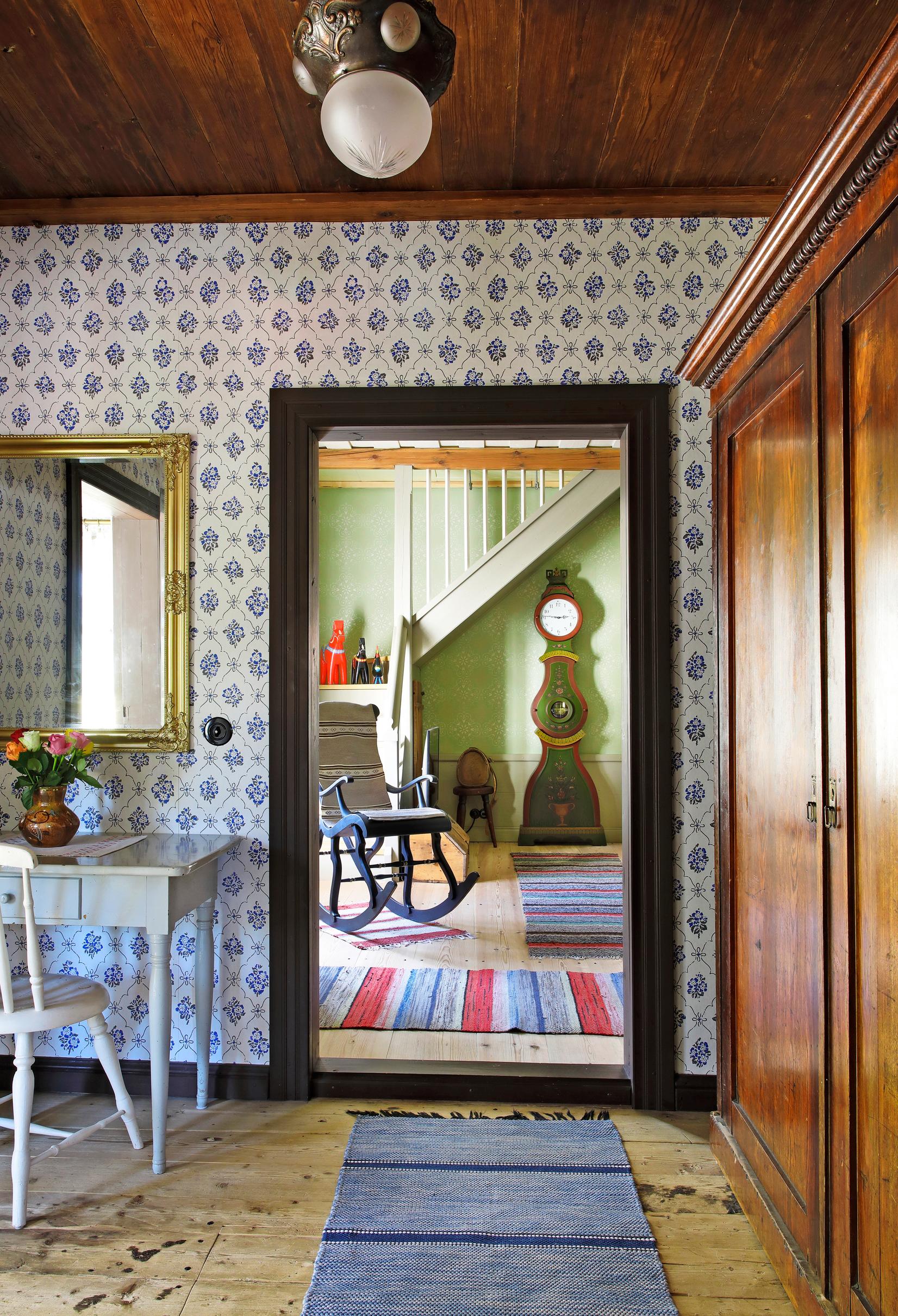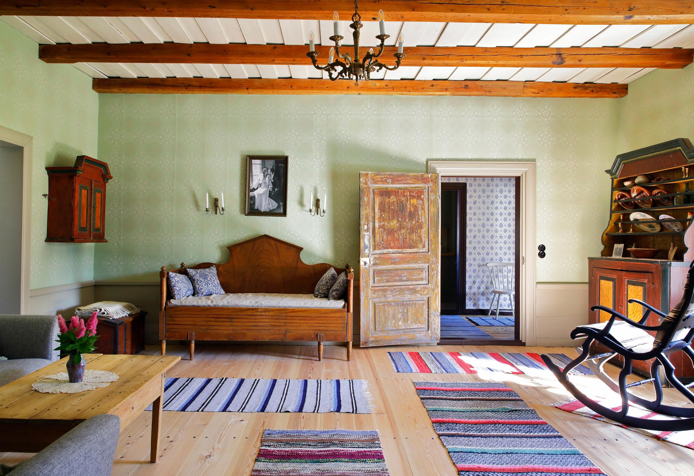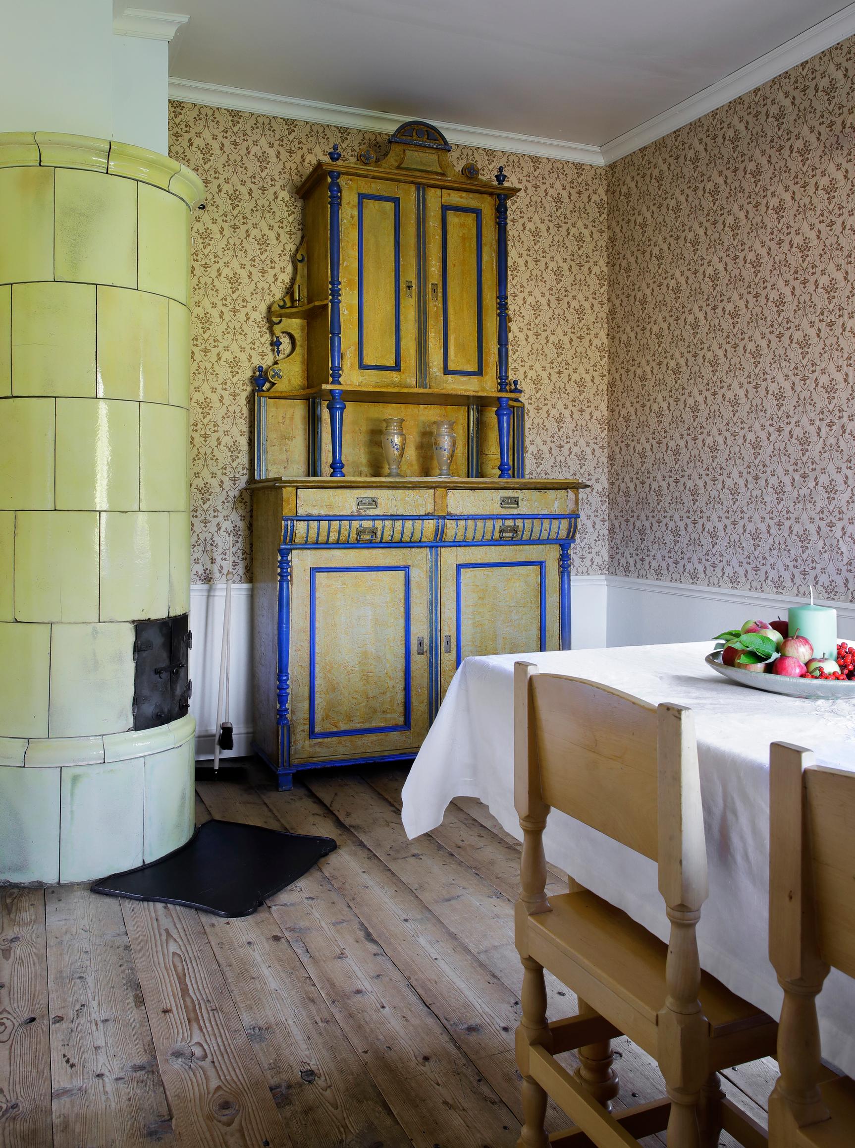 Unfortunately, the house’s log walls had once been straightened with a dull axe, allowing only some of them to remain exposed. The Fröjdös used eco-friendly wood-fiber insulation and board for the walls, and sometimes a layer of heavy paper. In the oldest part, Lisa applied rag paper sheets, painted with her own egg tempera recipe. While in a café in Turku, she found a stencil pattern she liked for the living room walls—executing it took three weeks.