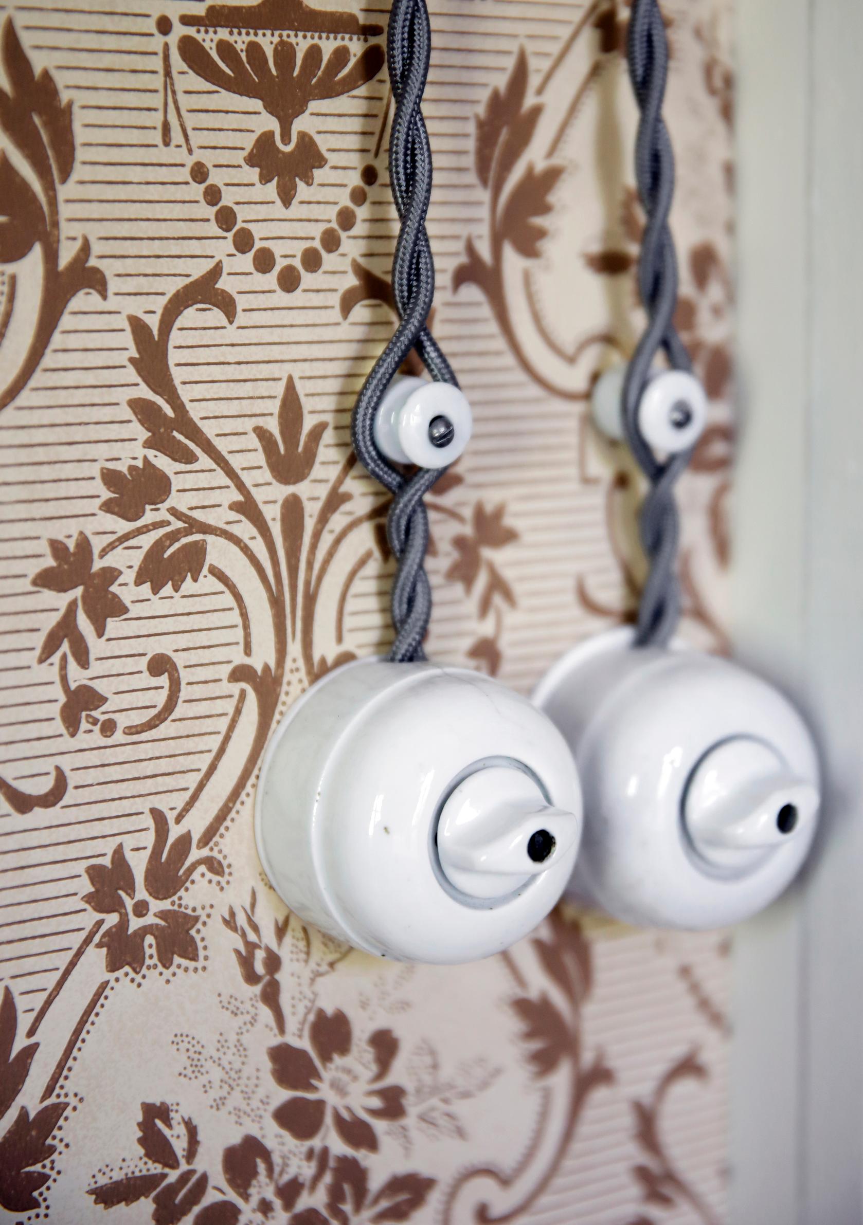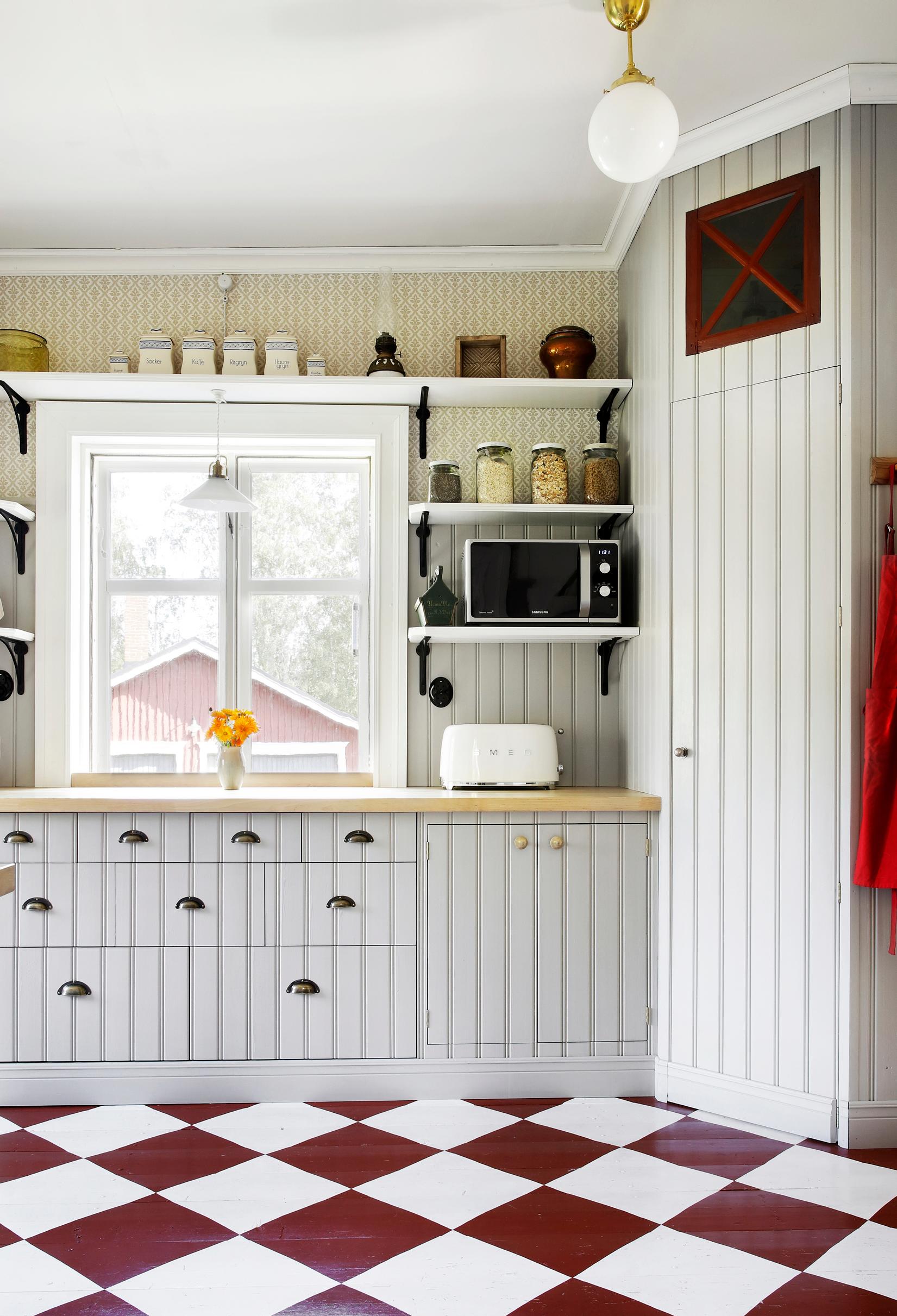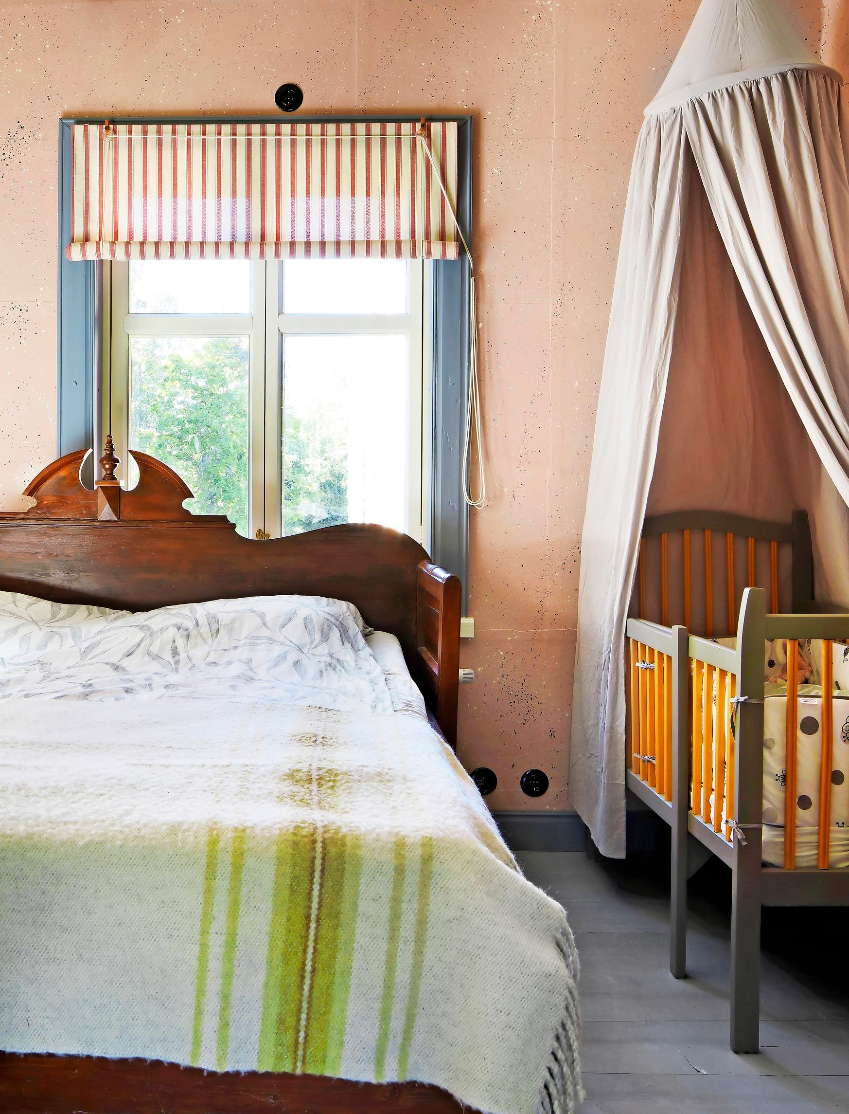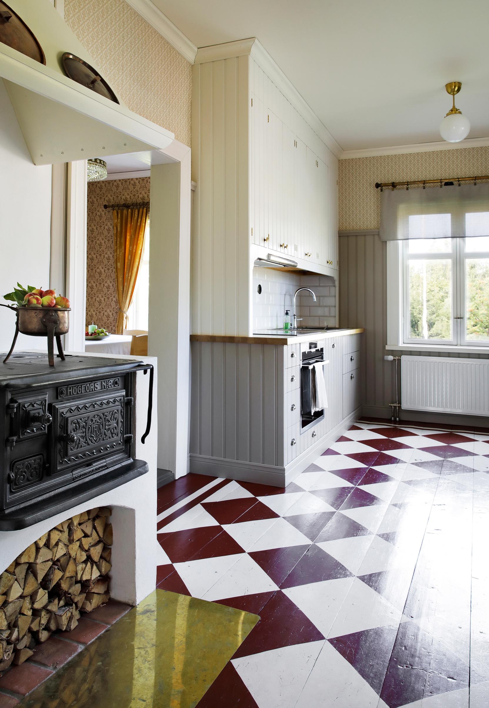 Unfortunately, the house’s log walls had once been straightened with a dull axe, allowing only some of them to remain exposed. The Fröjdös used eco-friendly wood-fiber insulation and board for the walls, and sometimes a layer of heavy paper. In the oldest part, Lisa applied rag paper sheets, painted with her own egg tempera recipe. While in a café in Turku, she found a stencil pattern she liked for the living room walls—executing it took three weeks.