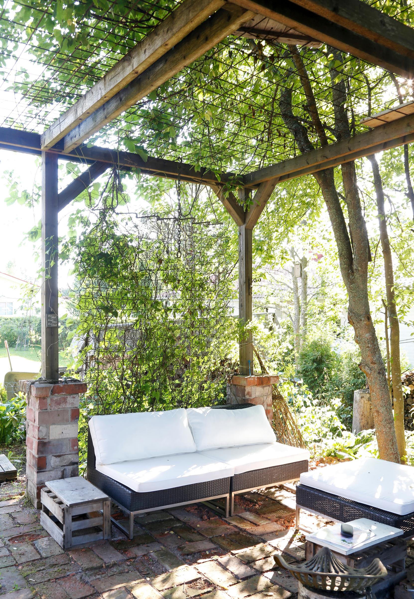 A pergola furnished with recycled items is this family’s favorite spot on hot days and on evenings, when they grill sausages in the pergola. The pergola floor is paved with 600 bricks salvaged from a demolished house.