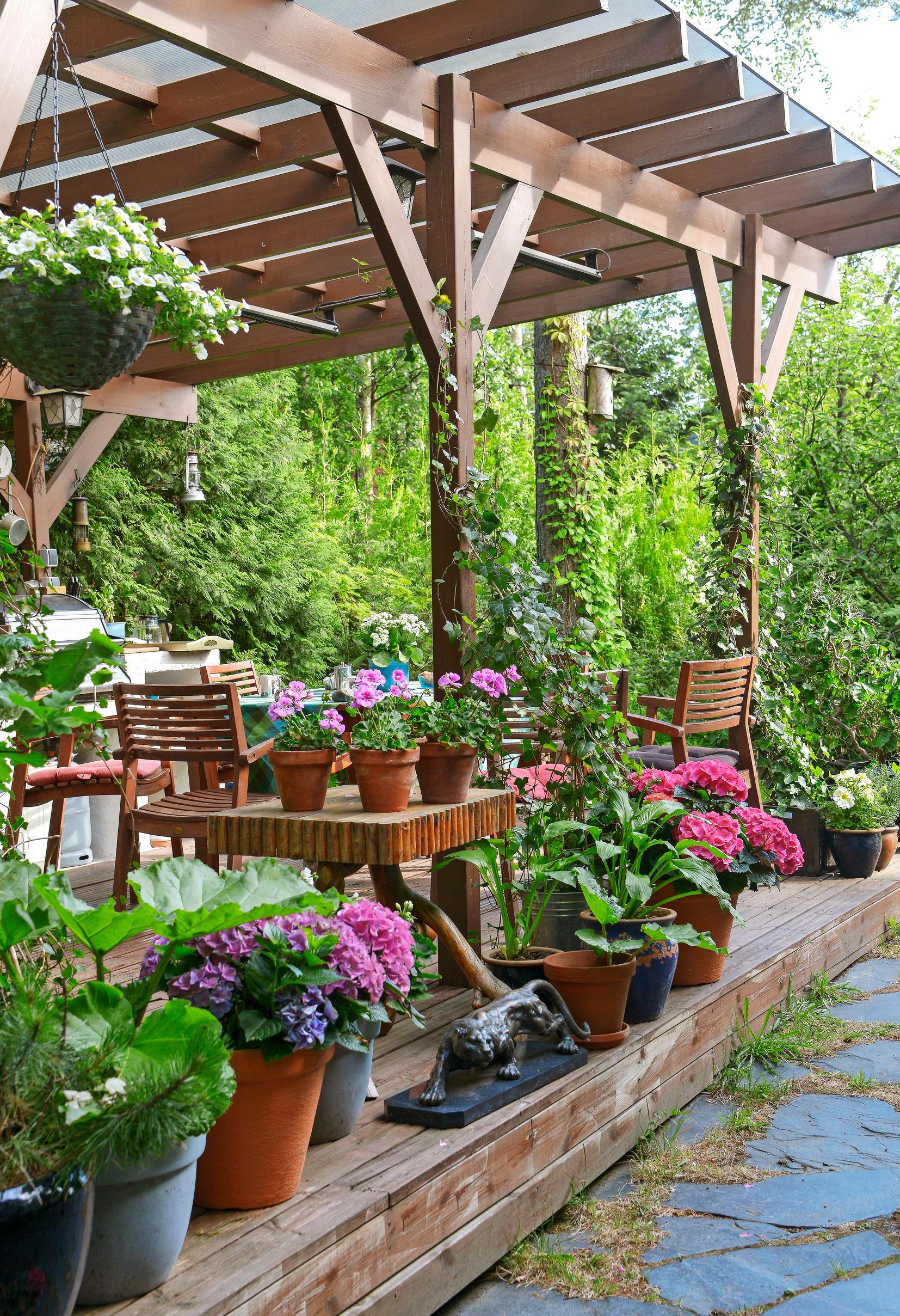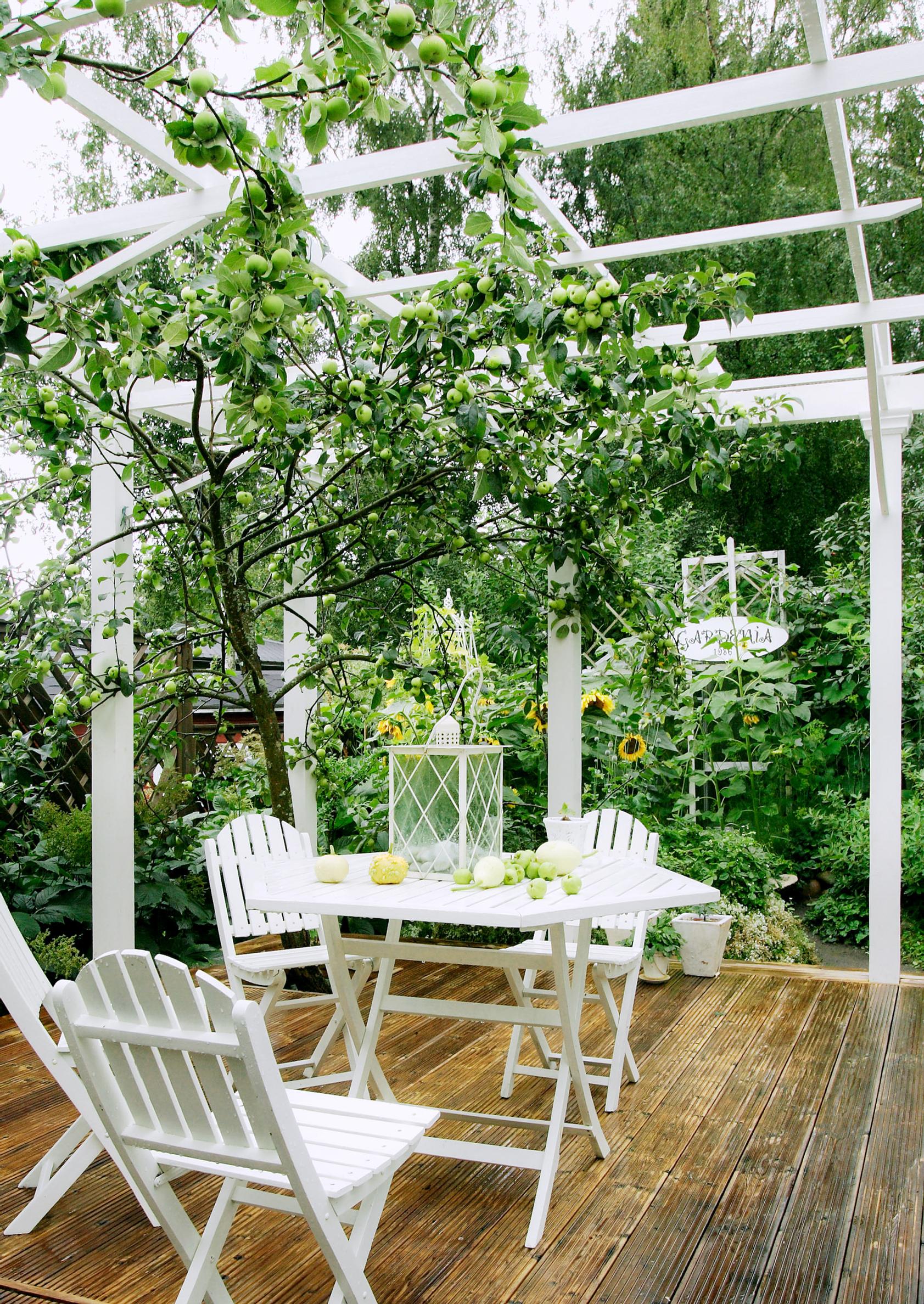 This pergola built on a wooden deck creates a cozy garden room. On the flat surface, garden furniture stays stable and is easy to move. Together, the pergola and the apple tree growing through the deck form an airy ceiling that doesn’t block the sun’s rays.