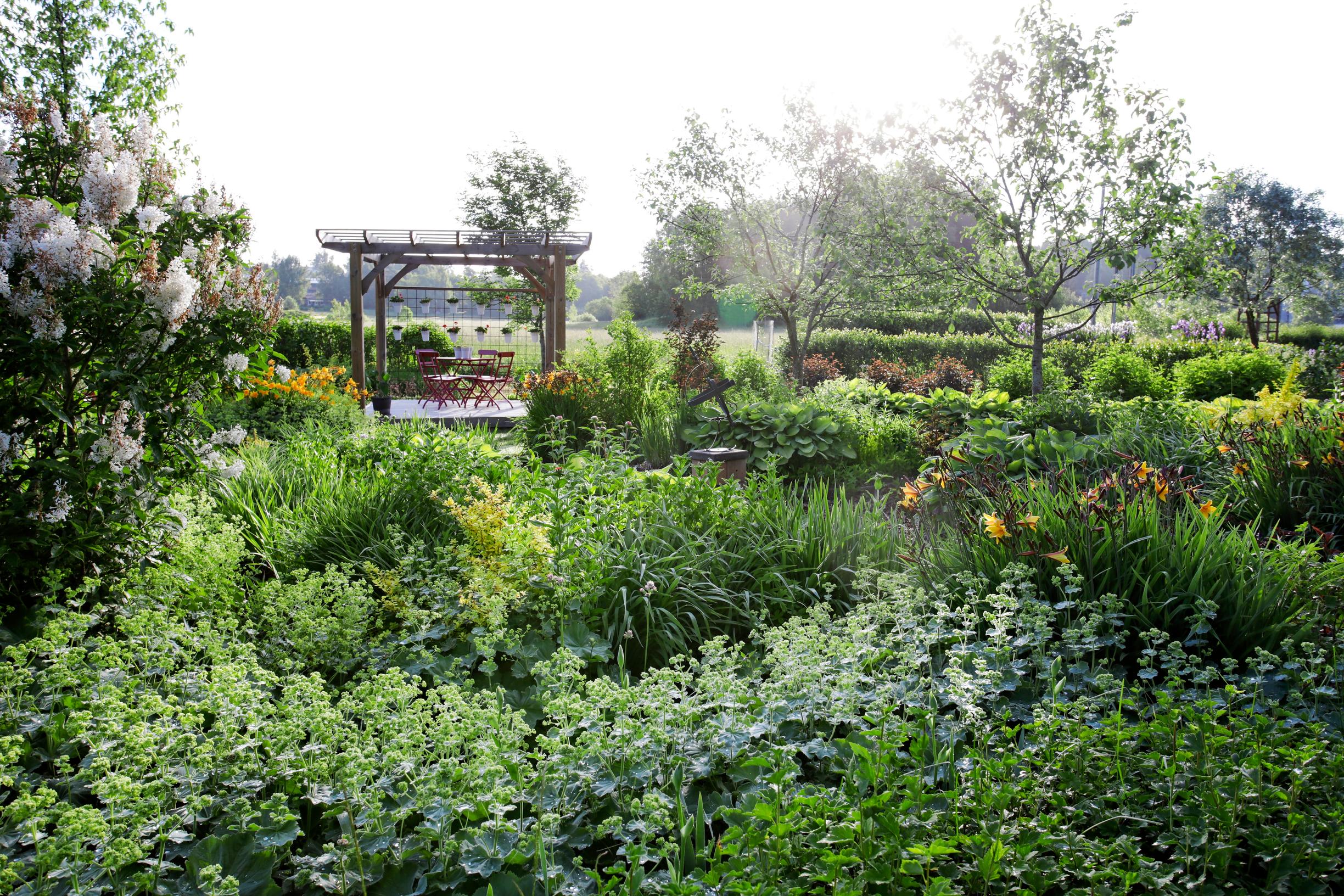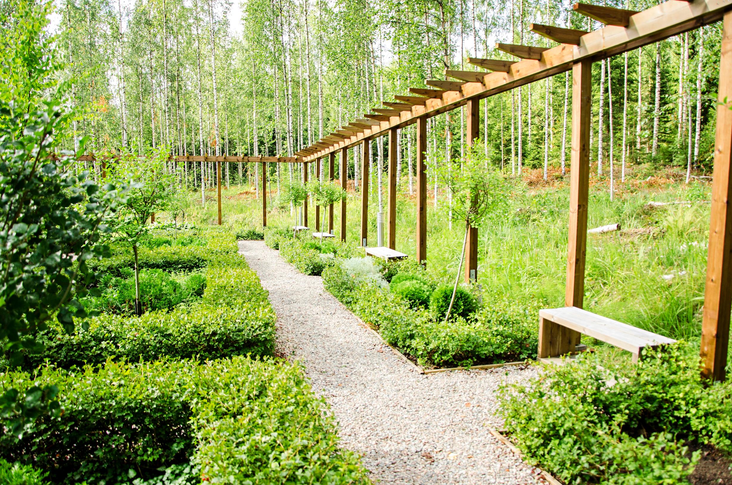 This terrace-like pergola is a perfect spot to admire the peonies and observe the life in the nearby garden pond.