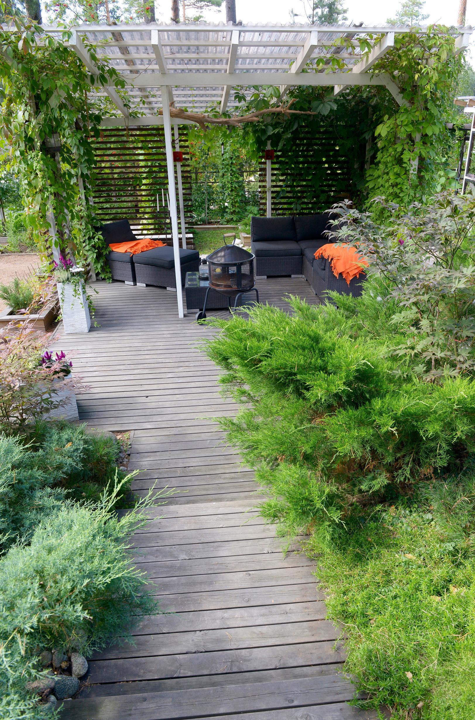 A pergola designed for relaxation is more sheltered, and therefore more usable, if at least one of its sides has a wall that protects from wind and rain. This garden is adorned with a lounging pergola that is a popular spot in the summer. The pergola is covered with Virginia creeper, making it pleasantly shady.