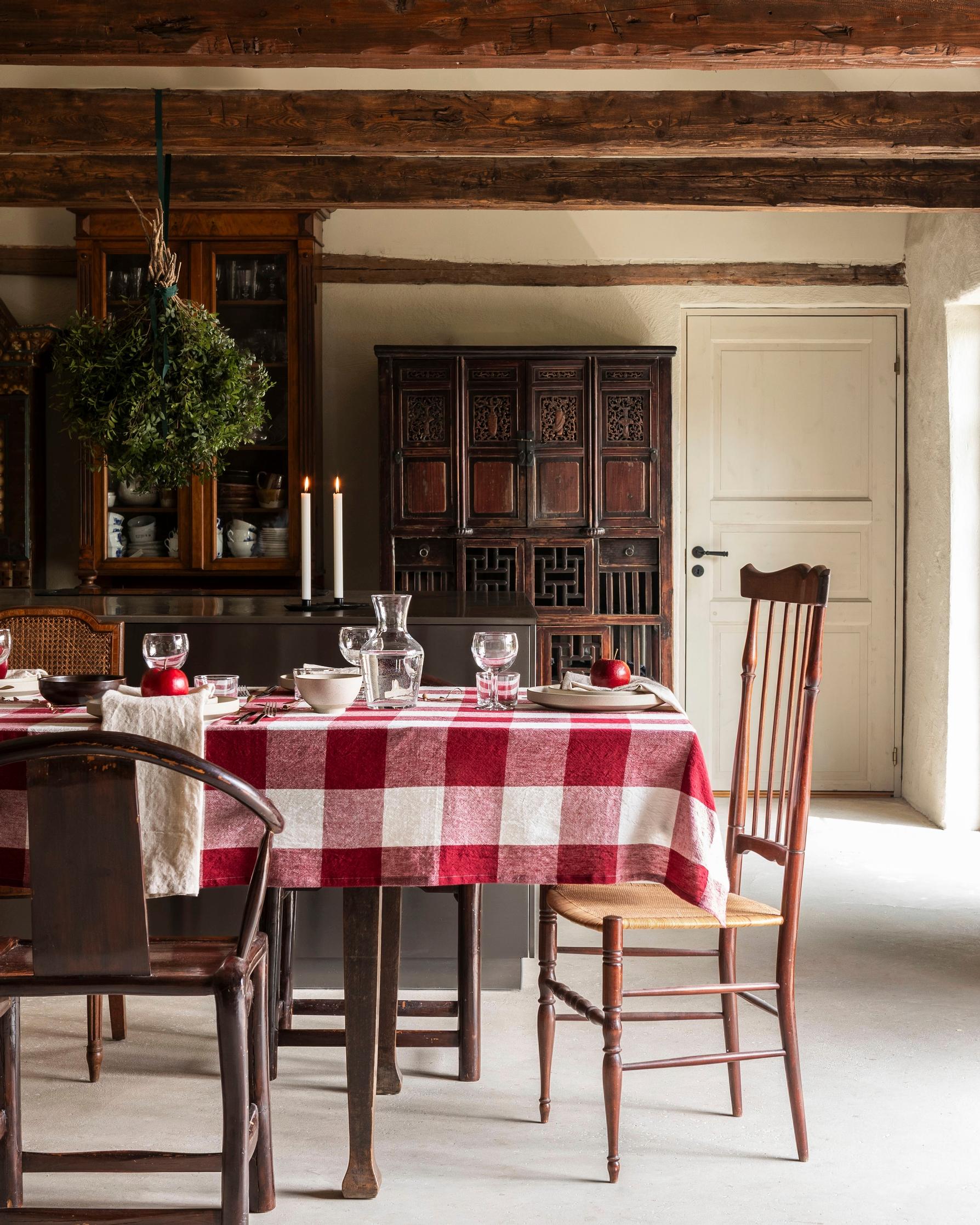 In a minimalist table setting, let the tablecloth be the showstopper. Oversized checks are especially on-trend this Christmas. The textiles and tableware are from Granit’s holiday collection.