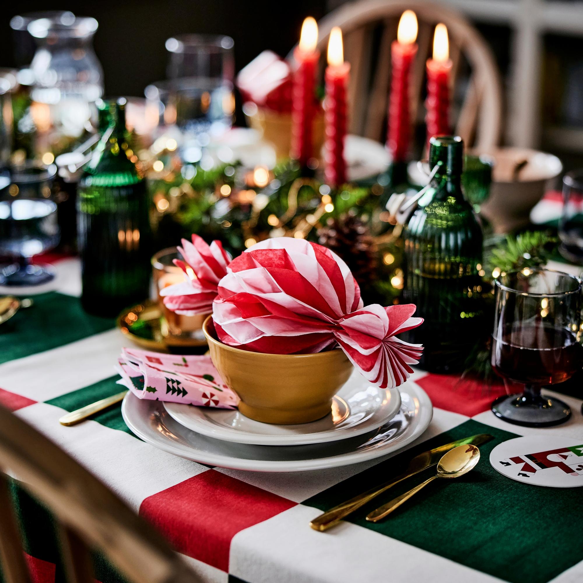 A paper pom-pom candy makes a playful accent on the table. An evergreen garland suits both abundant and minimalist Christmas settings. Add a string of LED lights for sparkle. The products pictured are from IKEA.