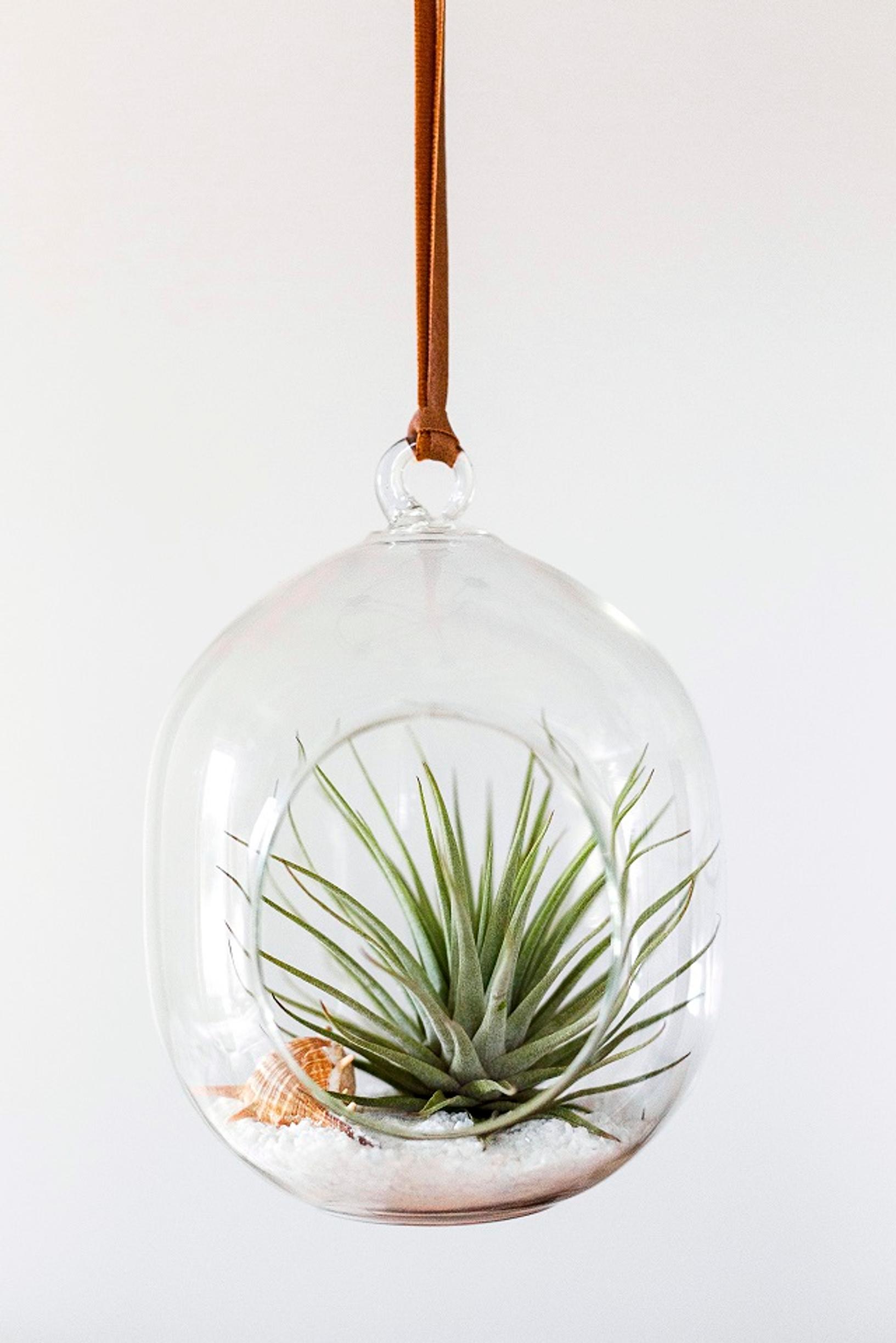 In the protective environment of a glass terrarium, the air plant can make use of the moisture it releases through evaporation. Create a mini landscape in the terrarium with sand, stones, and seashells.