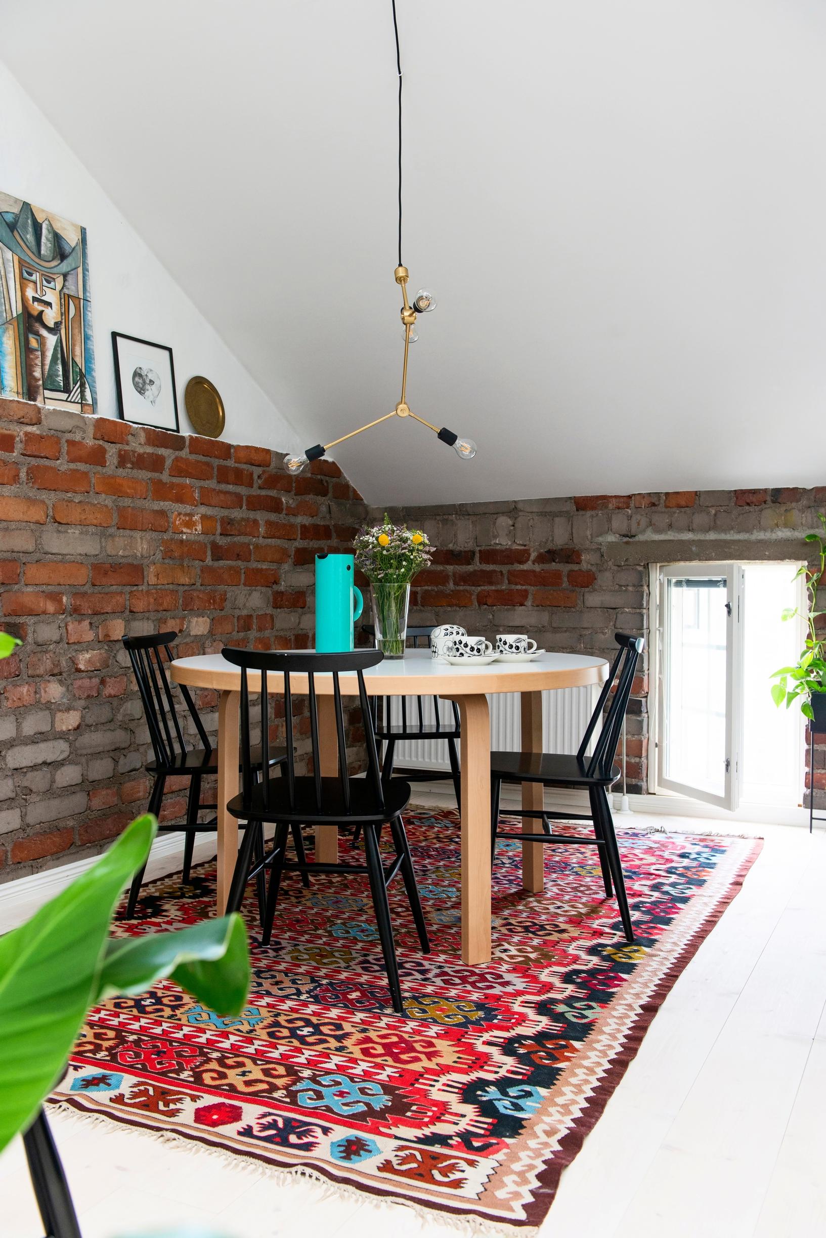 Anna and Miika bought their Helsinki apartment with “potential goggles” on. After three months of renovations, they now enjoy a converted attic space featuring a rugged brick wall and room for inherited treasures and Grandma’s art.