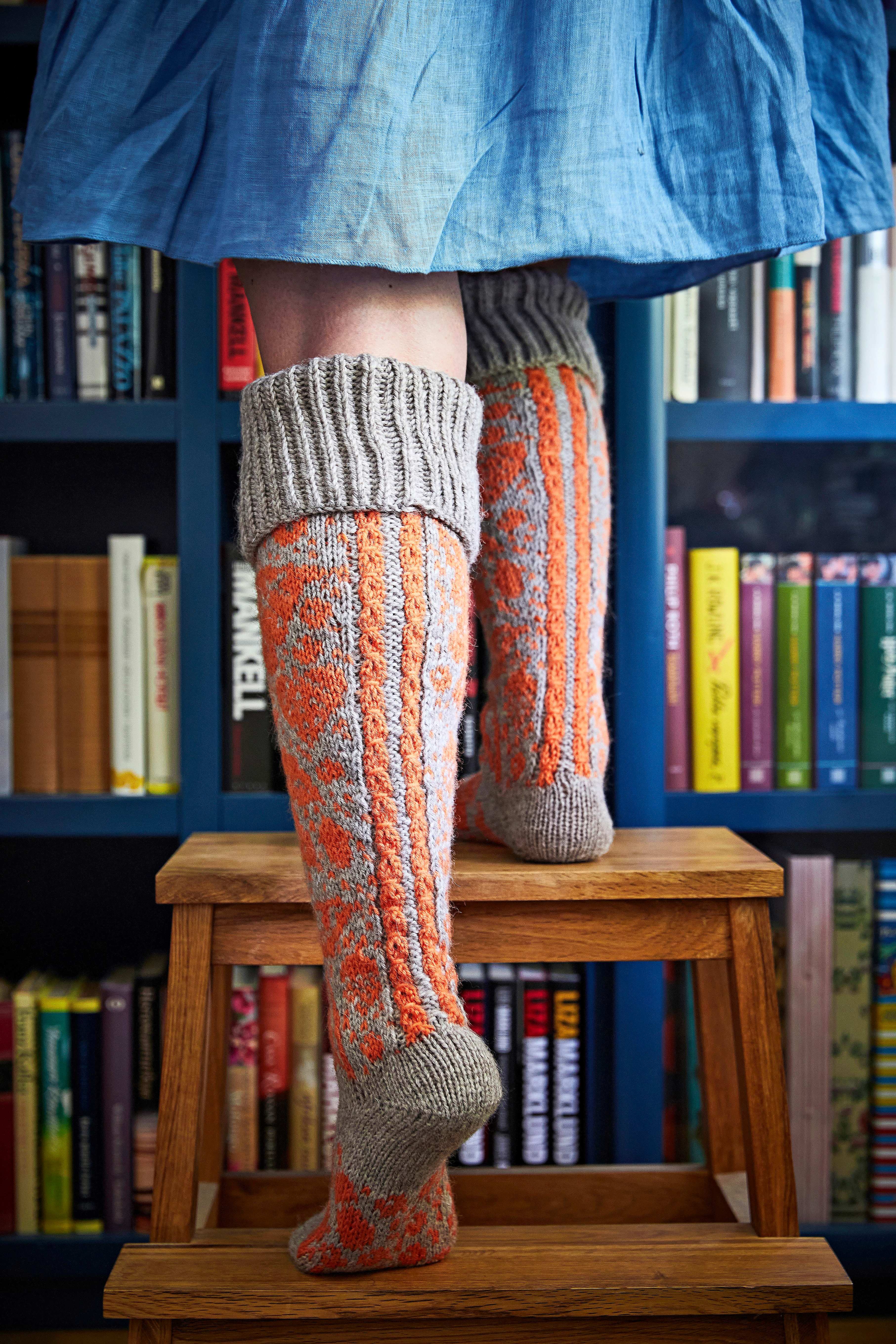 The designer of the Autumn love socks, Kati Rahikainen, loves crisp autumn days with falling leaves. These memories from her dog walks found their way into the socks. At her sister’s request, she also included one heart-shaped leaf.