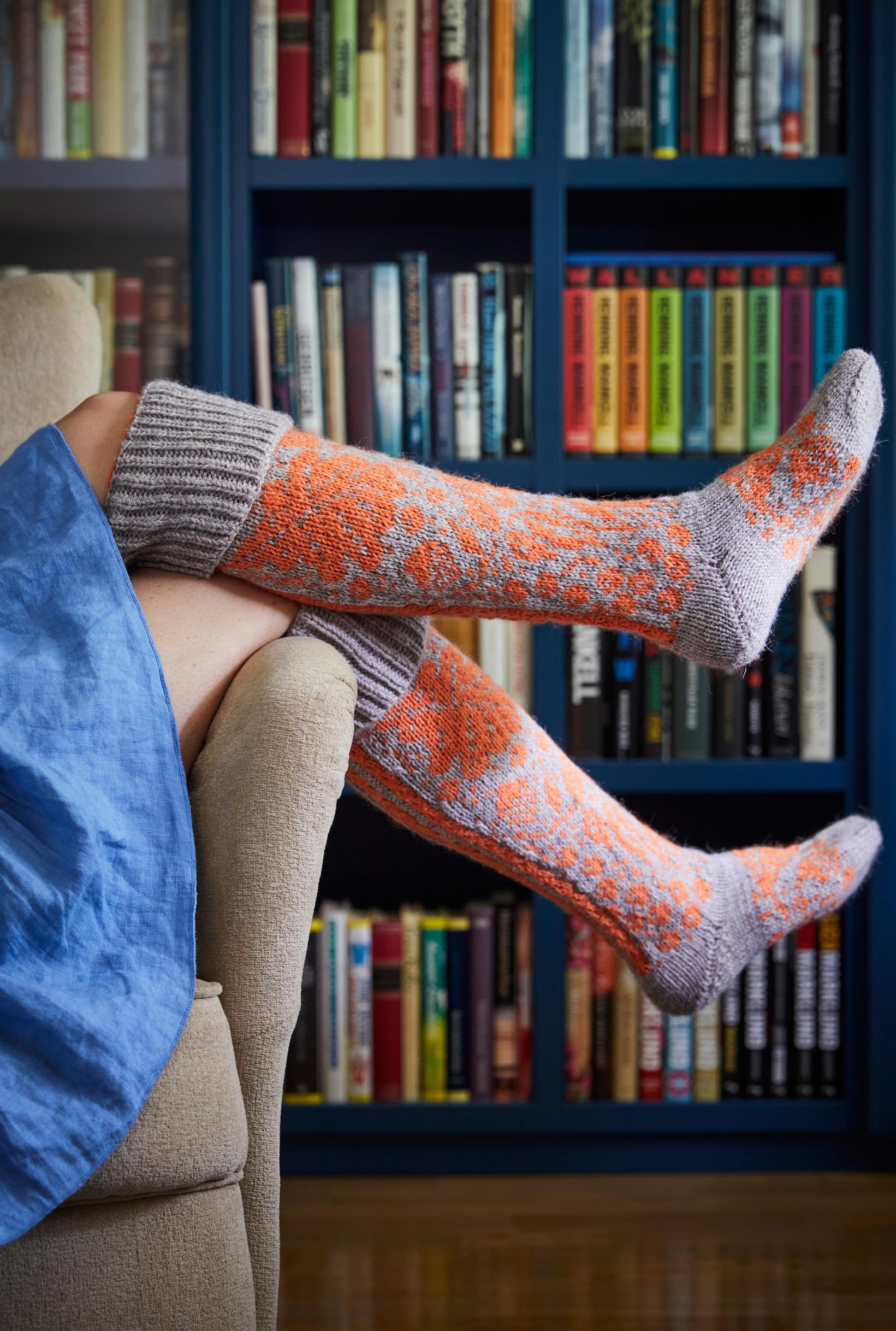 The Autumn love colorwork socks feature brioche, mock cables, and an hourglass heel