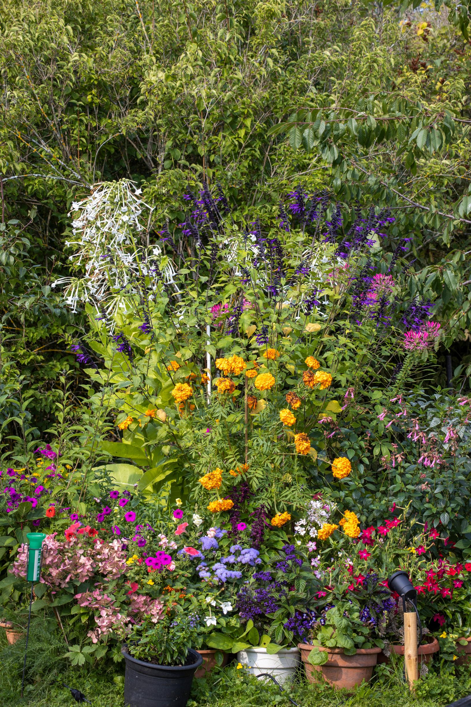 I aim for balanced groupings with complementary colors and compatible growth habits. I cluster pots close together so they gradually grow into one another. That arrangement remains all summer because stronger plants can’t overwhelm the others. In the center, I use 80-centimeter-wide containers for flowering tobaccos, tall salvias, castor beans, and spider flowers. Around the edges, in 30-centimeter pots, I often grow heliotrope, impatiens, petunias, blue daze, and melampodium.