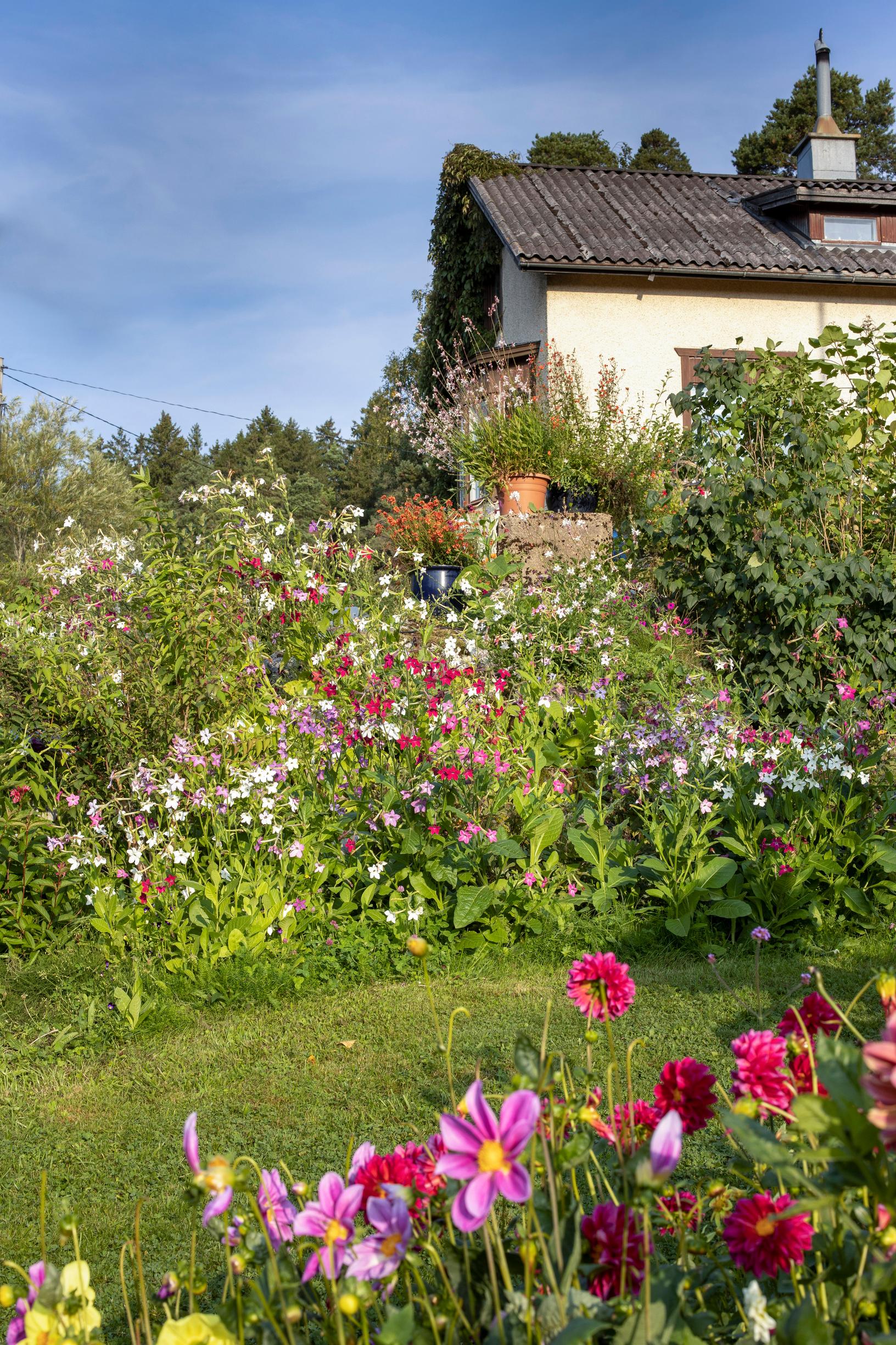 I enjoy it when plants self-sow and spread on their own. It’s always exciting to see which seedlings appear where. My rule is that every flower gets a chance to bloom. This yard is wild and informal—just like nature.