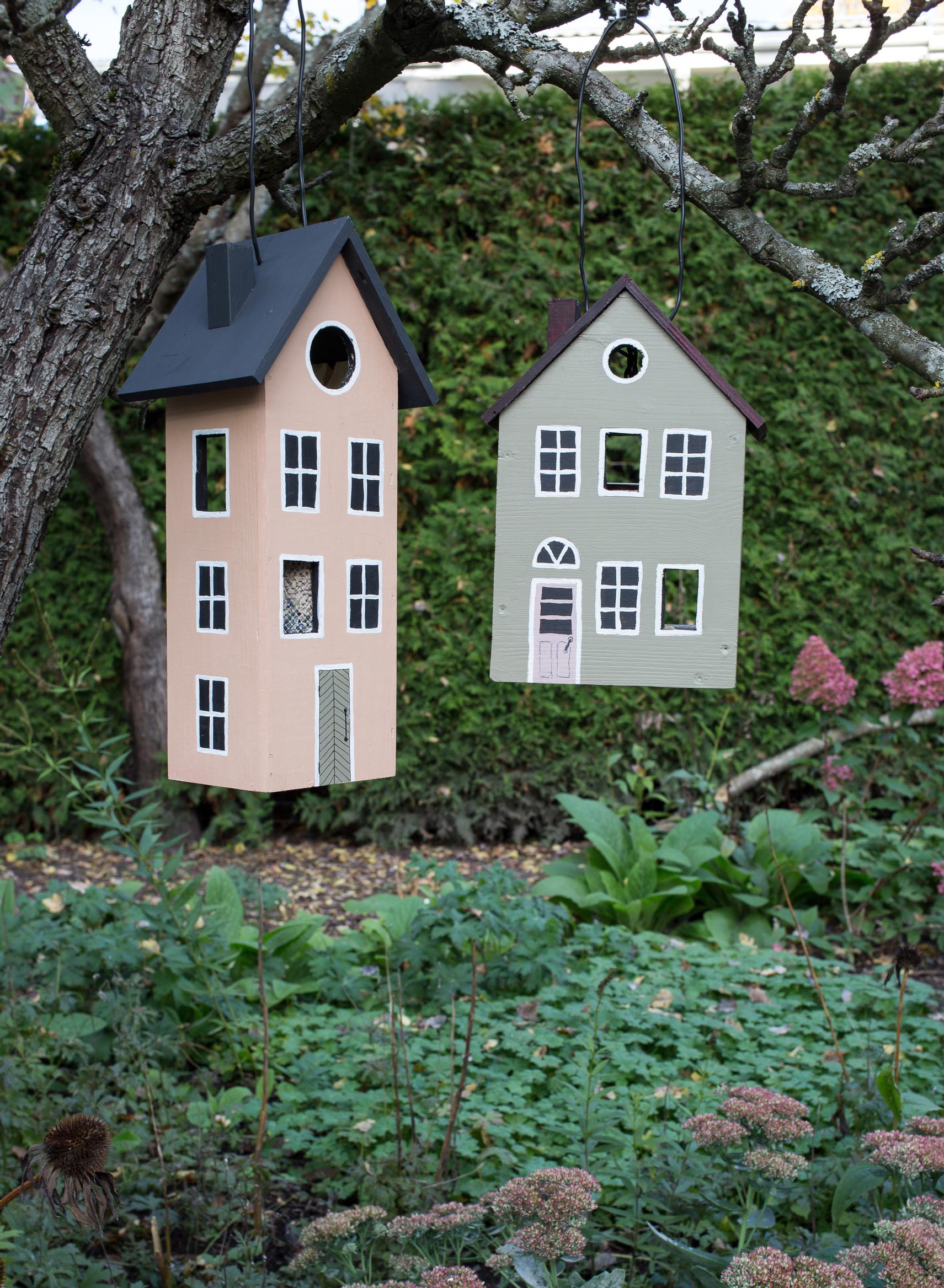 - Balance the finished house on your finger from inside the roof ridge to find and mark the point where the house hangs straight. Drill holes there on both sides of the roof's centerline, about 3.5 cm from the ridge. Finally, thread the hanging string through the holes and tie it securely. Attach a feed bar to the hanging string so it hangs inside the house.