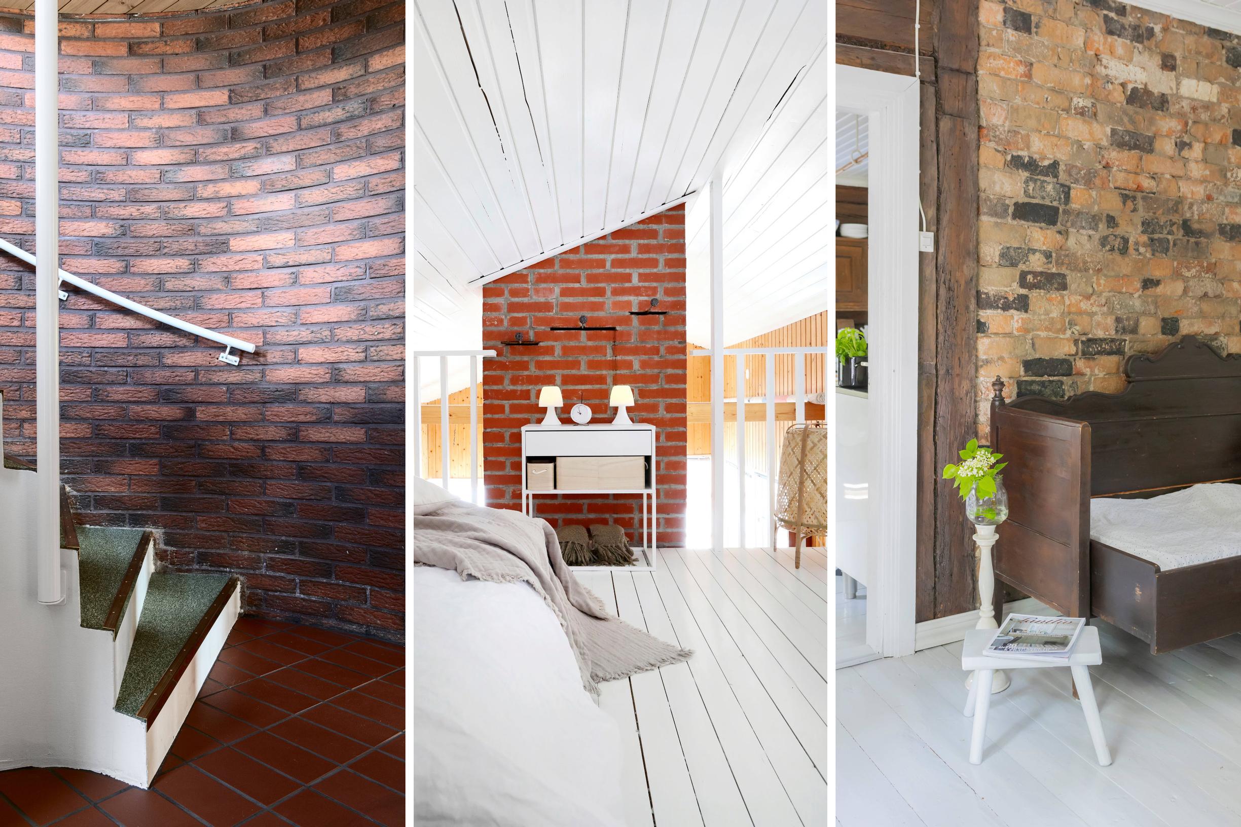 You can also apply a finish to your brick wall. Here, the lime plaster creates a uniform surface while retaining the pattern and varied texture of the brick. Paints specifically designed for brick surfaces are also available, so changing the color of the wall is also possible.