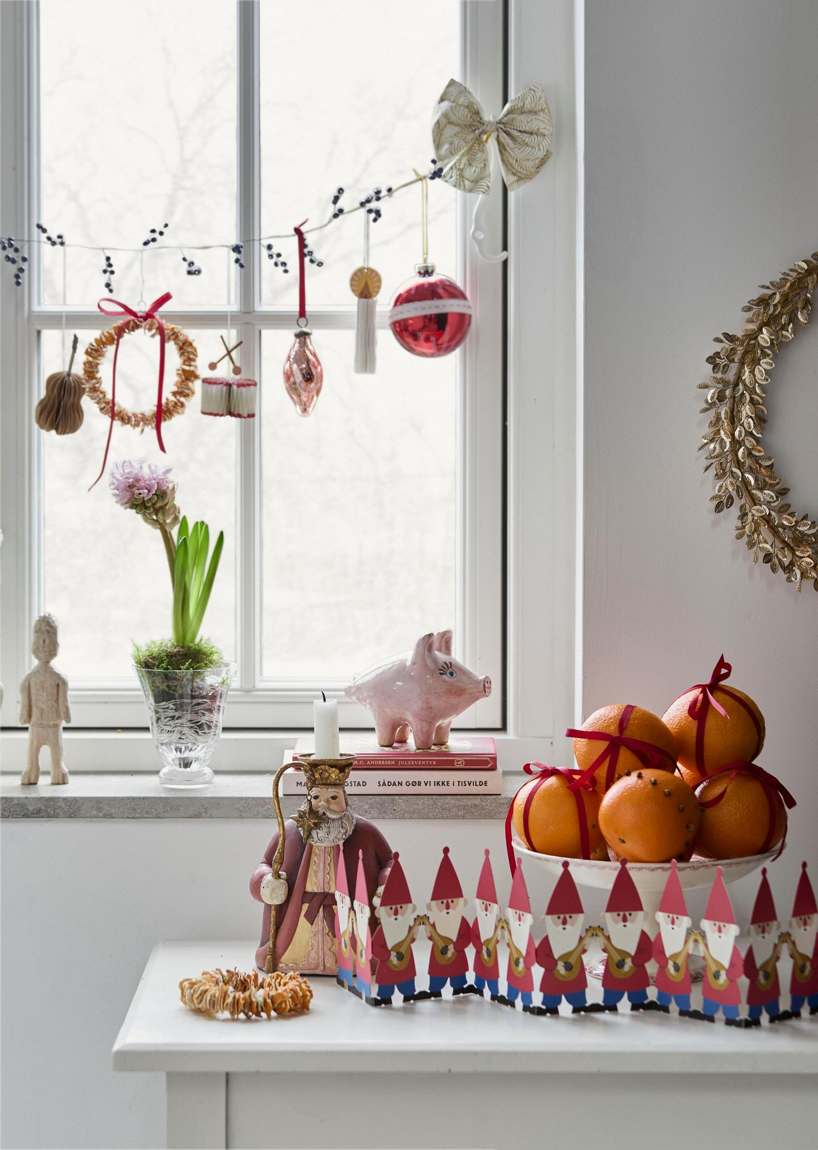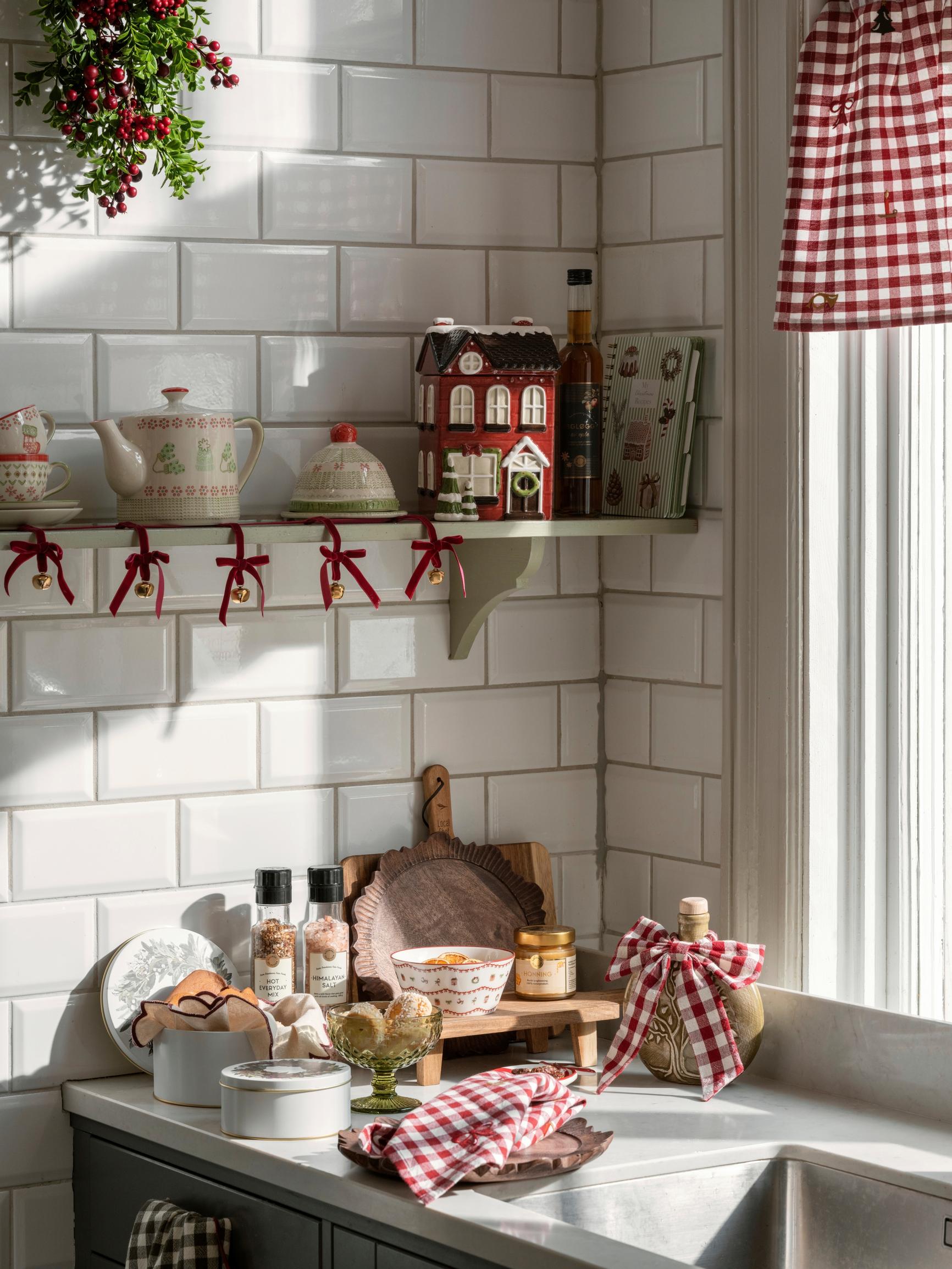 Create a treat station in the kitchen corner, where anyone can pop by for a snack whenever the mood strikes. A beautifully decorated treat table both looks and tastes wonderful. Don’t forget the shelf—tie ribbons along its edge, and showcase your prettiest holiday dishes. The products in the photo are from Hemtex’s Christmas collection.