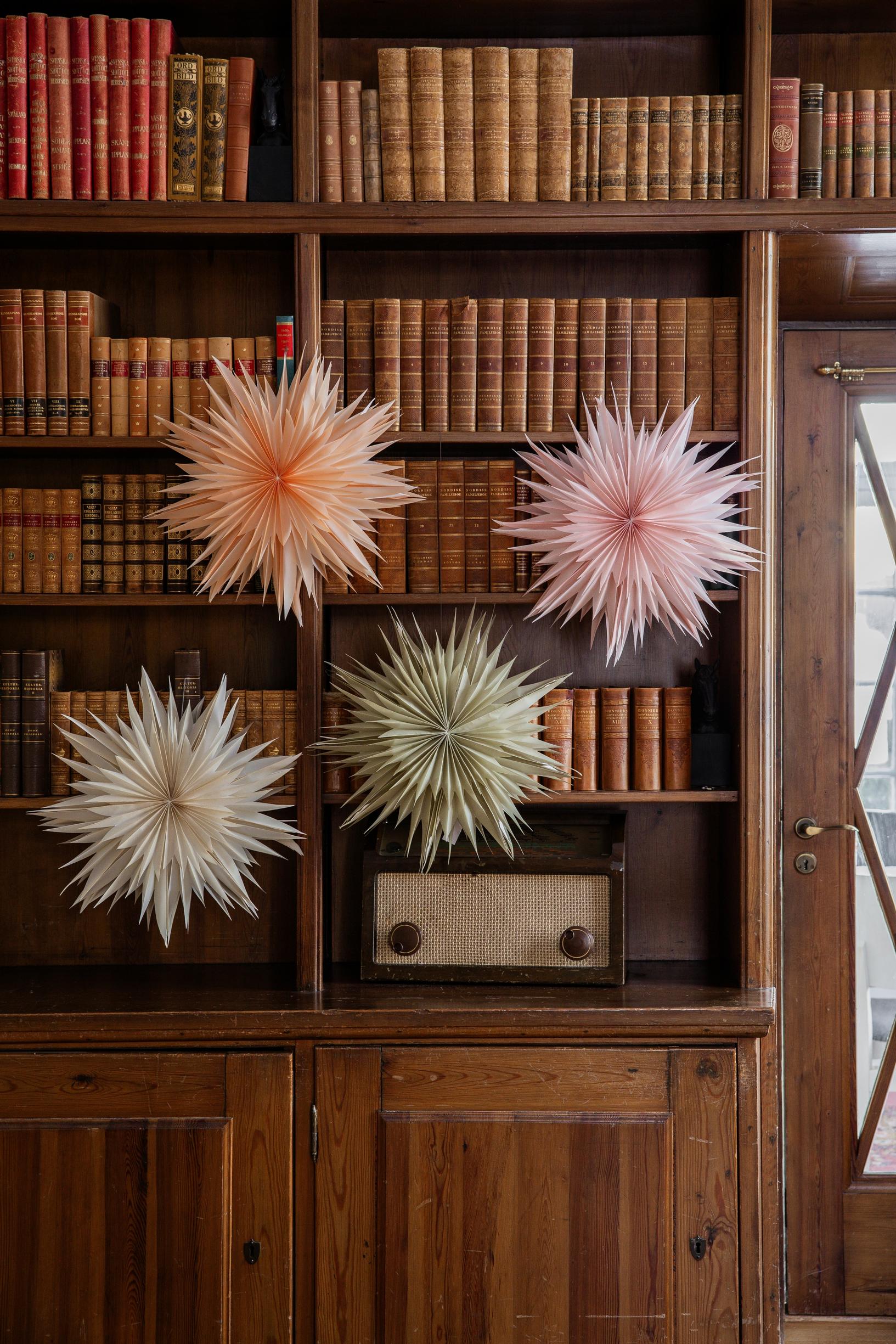 An ordinary bookshelf becomes magical with a few paper stars hung as decorations. Stick to a single color or mix your favorites. The paper stars in the picture are from Alde & Lind.