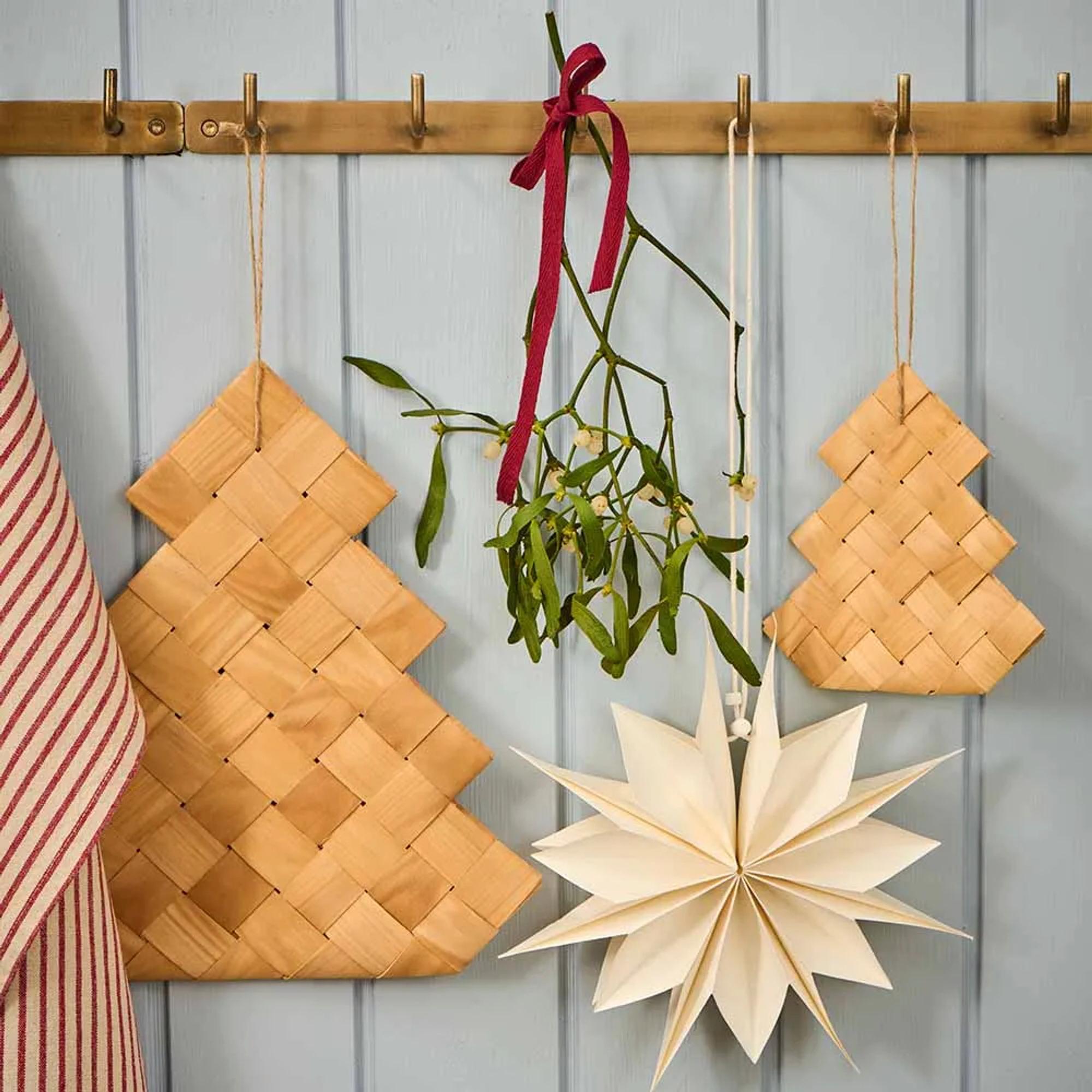 Nostalgic wood splint decorations delight anyone who loves tradition, and they fit in both minimalist and lavishly decorated homes. You can find affordable wood splint decorations at flea markets. The wood splint tree decorations in the photo come from Hyvän tuulen puoti.