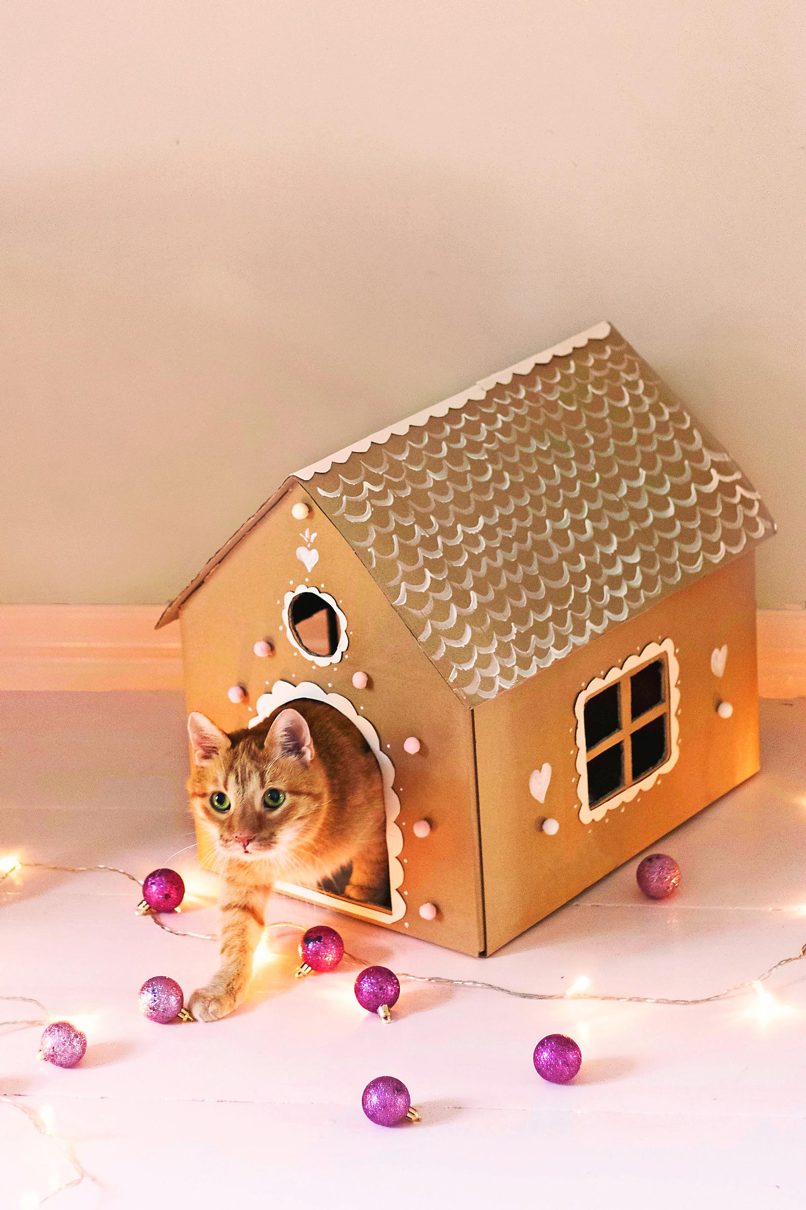 Your pet’s gingerbread house may look freshly baked, but it’s actually made from recycled cardboard. Decorate it with charming white details reminiscent of royal icing.