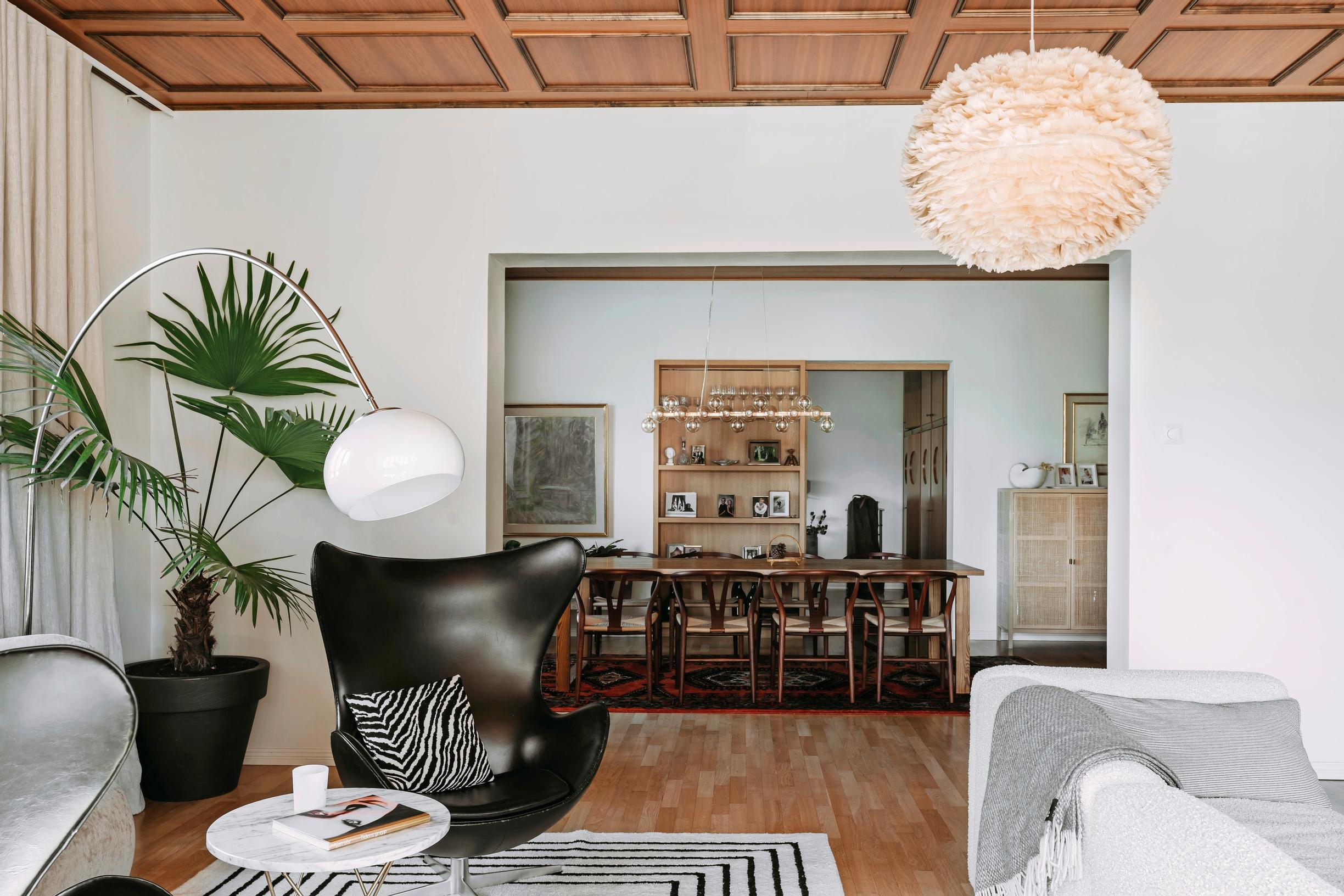 The apartment once belonged to the owners of the Ruola furniture factory, and the ceiling and cabinetry were made at Ruola’s plant in nearby Raisio specifically for this home. Later, in the 1970s–80s, the apartment served as a bank’s reception space and the bank manager’s residence.