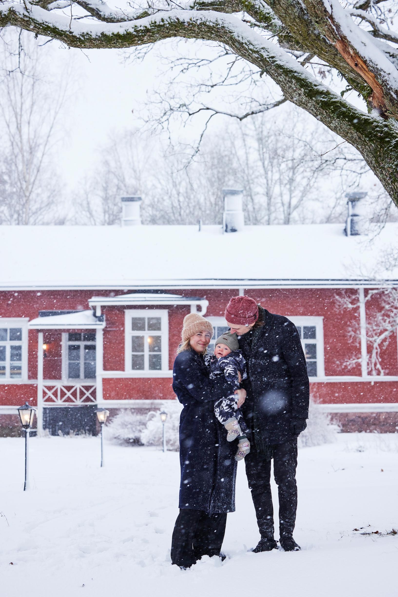 This more-than-a-century-old red-and-white log house stands proudly under the shelter of sturdy-trunked oaks. The snowfall remains outside the doors as Ninni, Gro and Rafael Donner warmly welcome you to their home, Ekkulla. While the snow changes the landscape, the house may already look familiar from television.