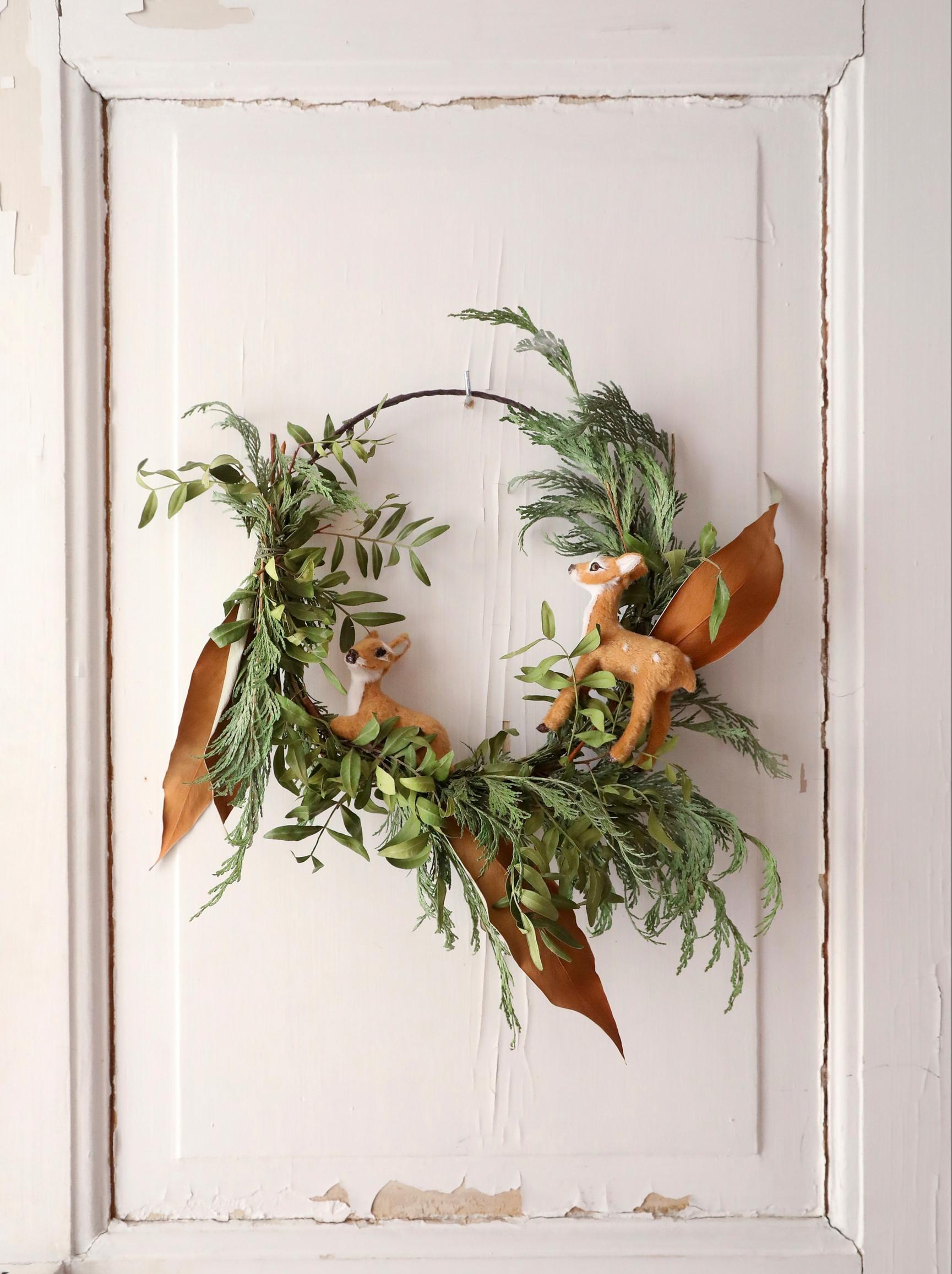 In her wreaths, Jenni favors materials from florists, which hold up better when dried than conifer branches that shed. She decorates them with natural finds like branches, grasses, and cones, as well as animal figurines borrowed from Helmi.