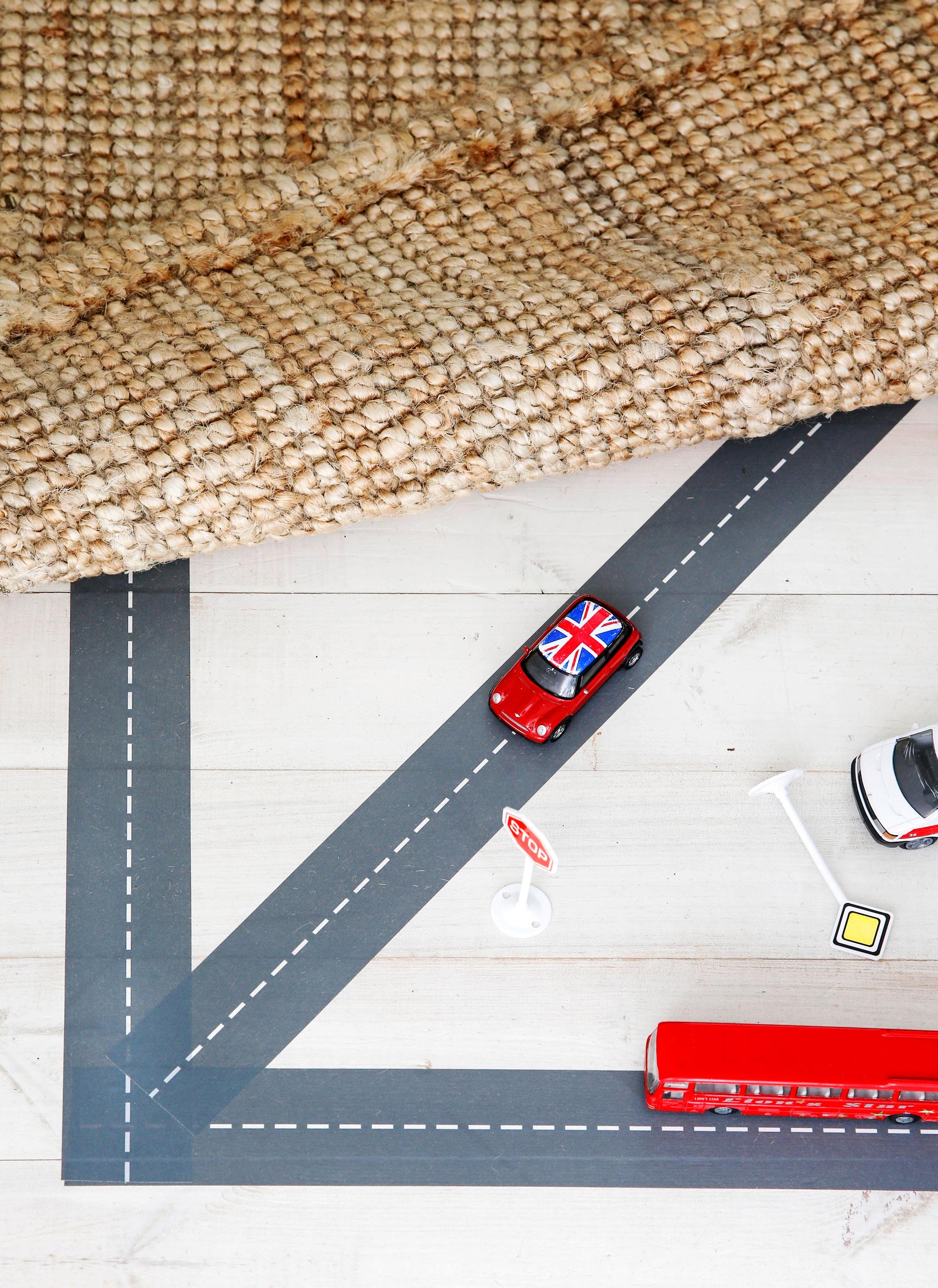 What fun could you hide under a rug? In this room, there’s a racetrack. It’s made with easily removable washi tape printed with a roadway pattern.