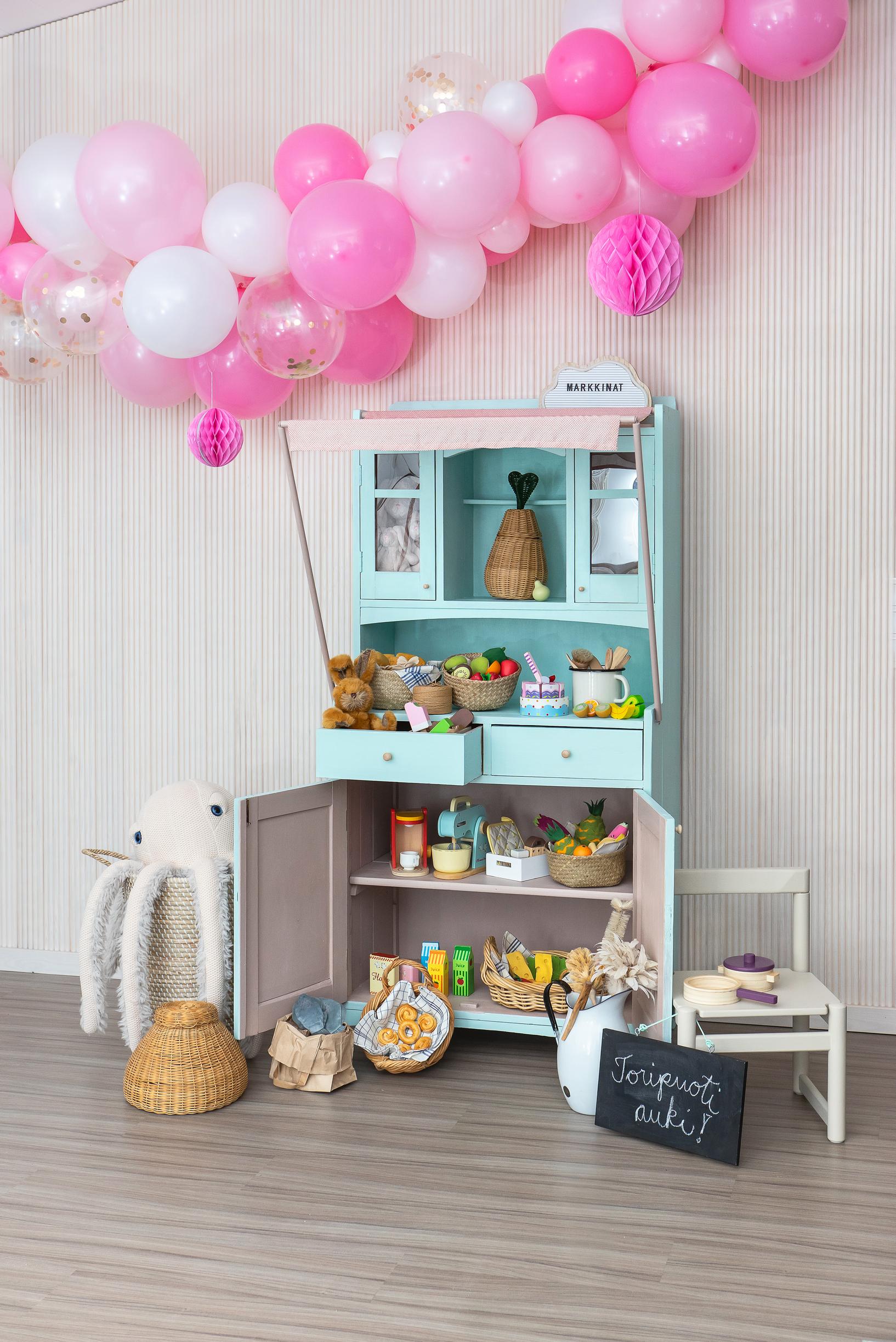 A bedroom cabinet turned into a pastel-hued store when it got a little awning and two paint colors. As well as being a play spot, the cabinet neatly stores all the pretend-store props.