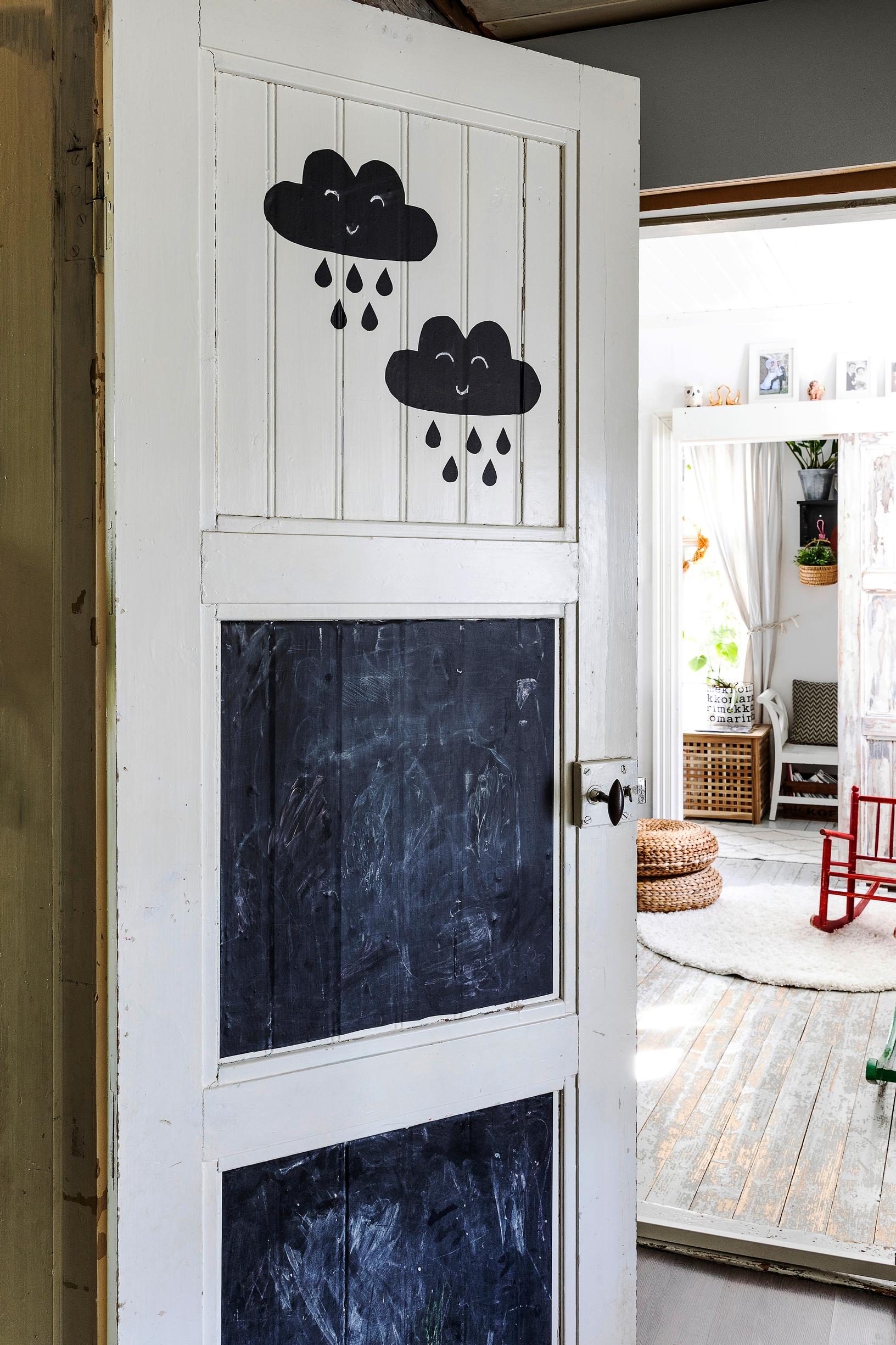 Give the door a makeover with chalkboard paint. It’s a spot for family notes—or a springboard for play: will the kids’ room be a weather station, a police station, or a travel agency today?