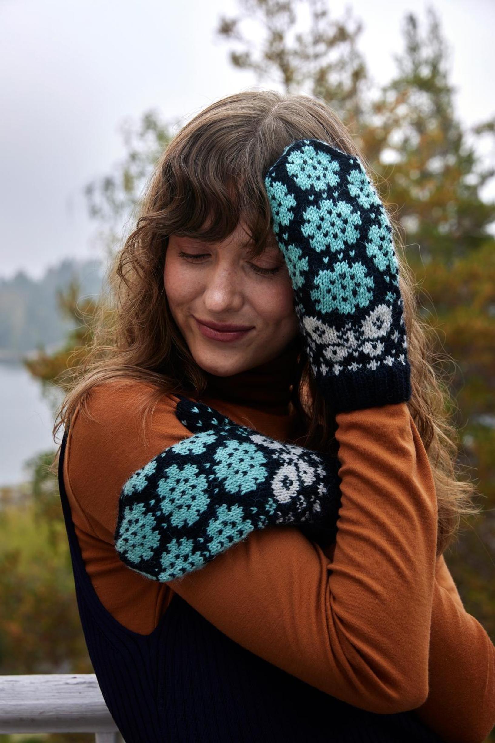 Butterflies flutter across the surface of these floral-patterned mittens, knitted in stranded colorwork. The thumb is placed using a traditional waste yarn method, making the mittens both timeless and technically rewarding to knit.