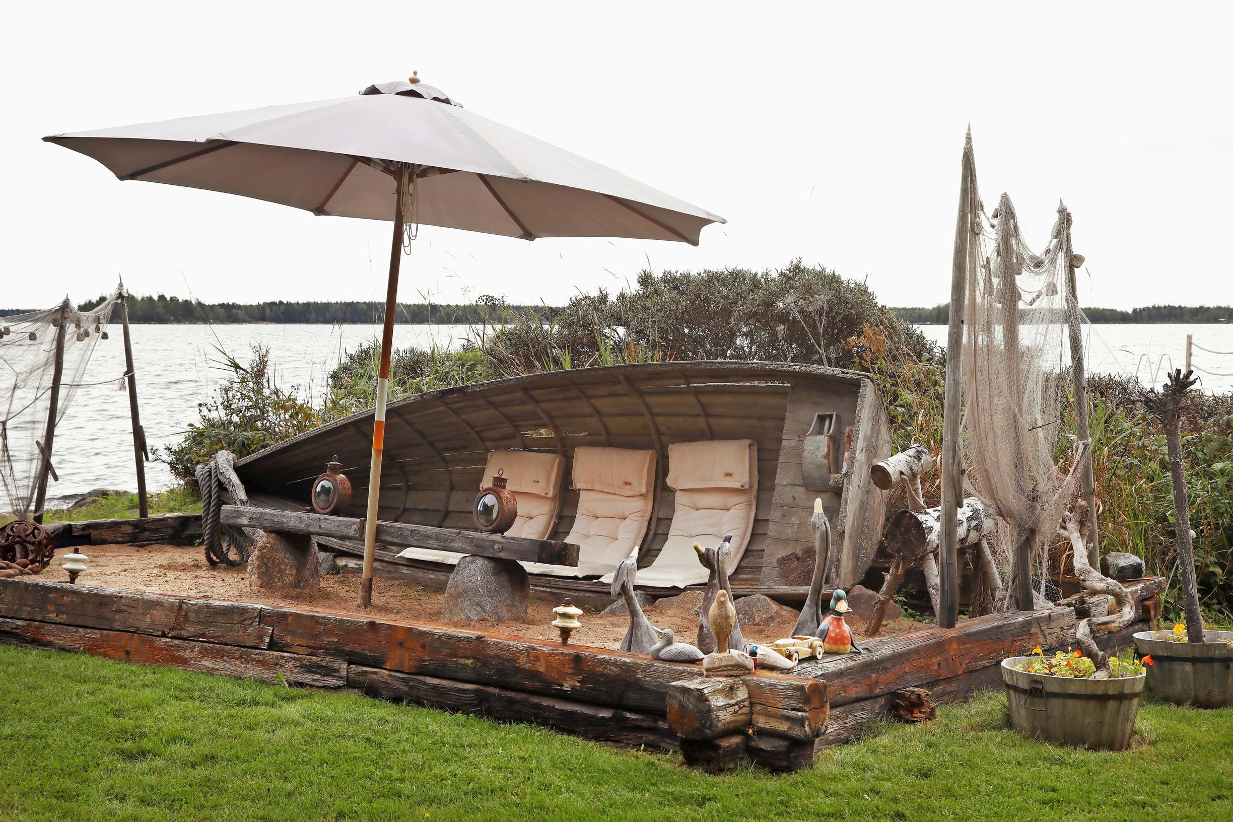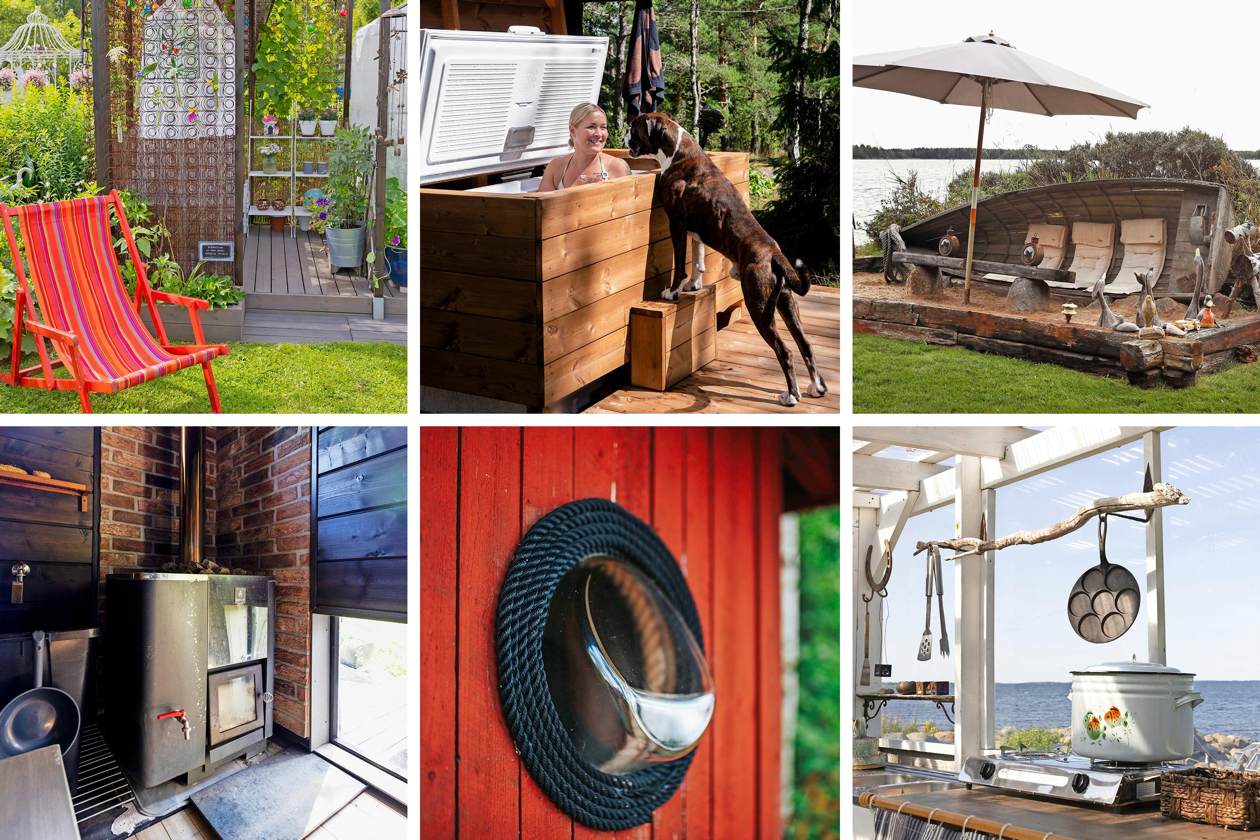 On Stora Högskäret Island in the Vaasa archipelago, not all boats float on the water. One has been turned into a wonderfully useful shelter. Sanna and Markku’s cottage features an old boat flipped onto its side along the edge of the children’s sandbox to create seating. Another old boat on the dock serves as a hideaway for their hot tub.