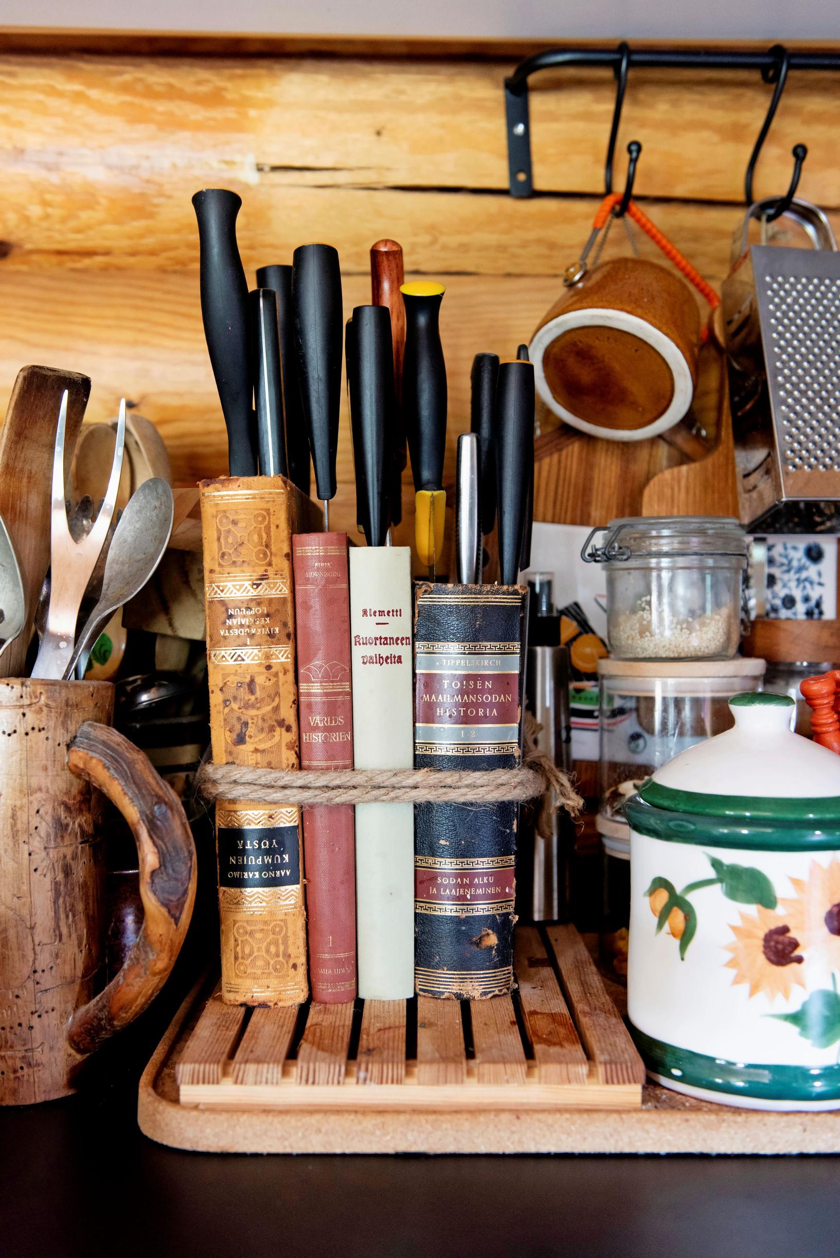 Old books can take up a lot of space when you don’t need them anymore—but not at this cottage! Here, several old books are joined together so their pages hold knives in place like a top-notch knife block.
