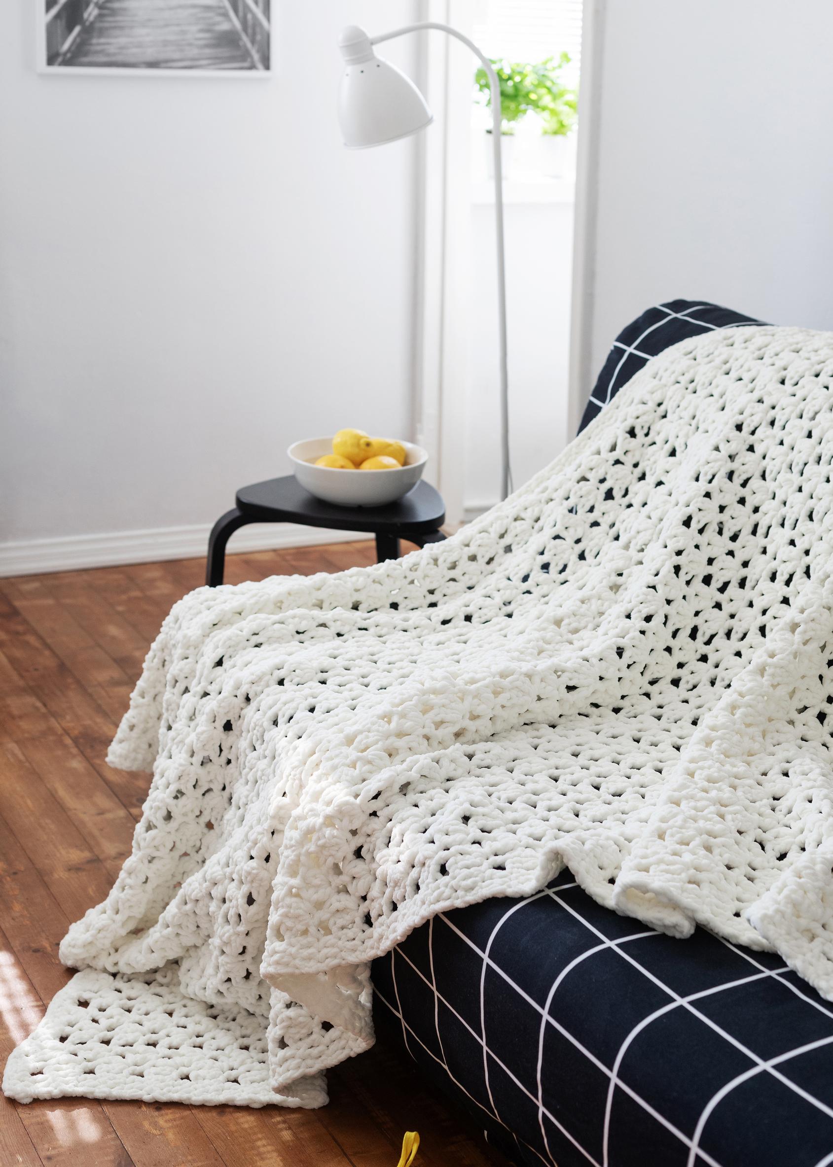 This beautiful crocheted throw invites you to curl up in a cozy corner of the sofa. Thanks to the chunky yarn, it works up in no time, and the lacy stitch pattern looks stunning. Our pattern lets you choose from three different sizes for your blanket.