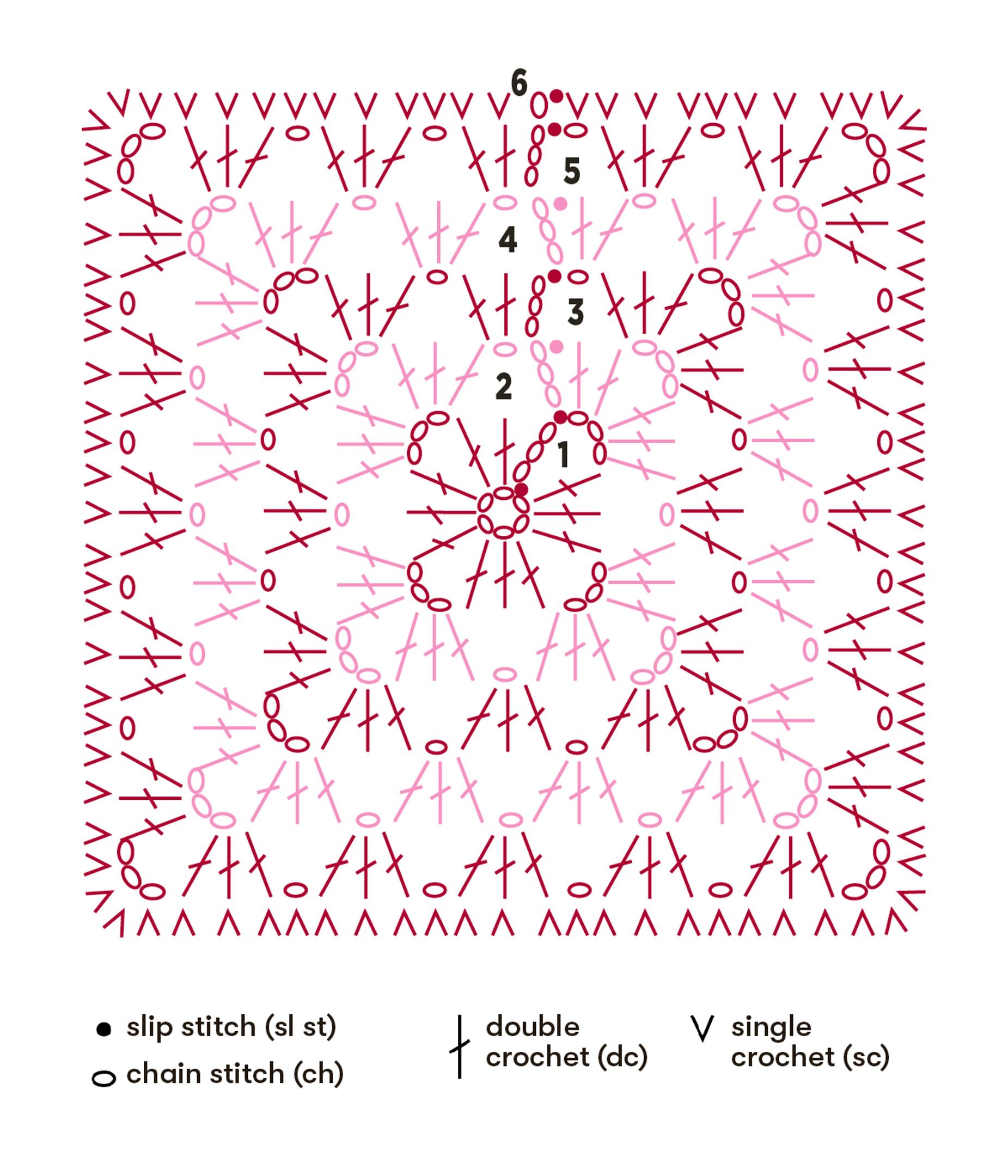 - Work the next three rnds in the same manner.Note! The chart shows only two additional rnds; crochet one extra rnd beyond the chart.