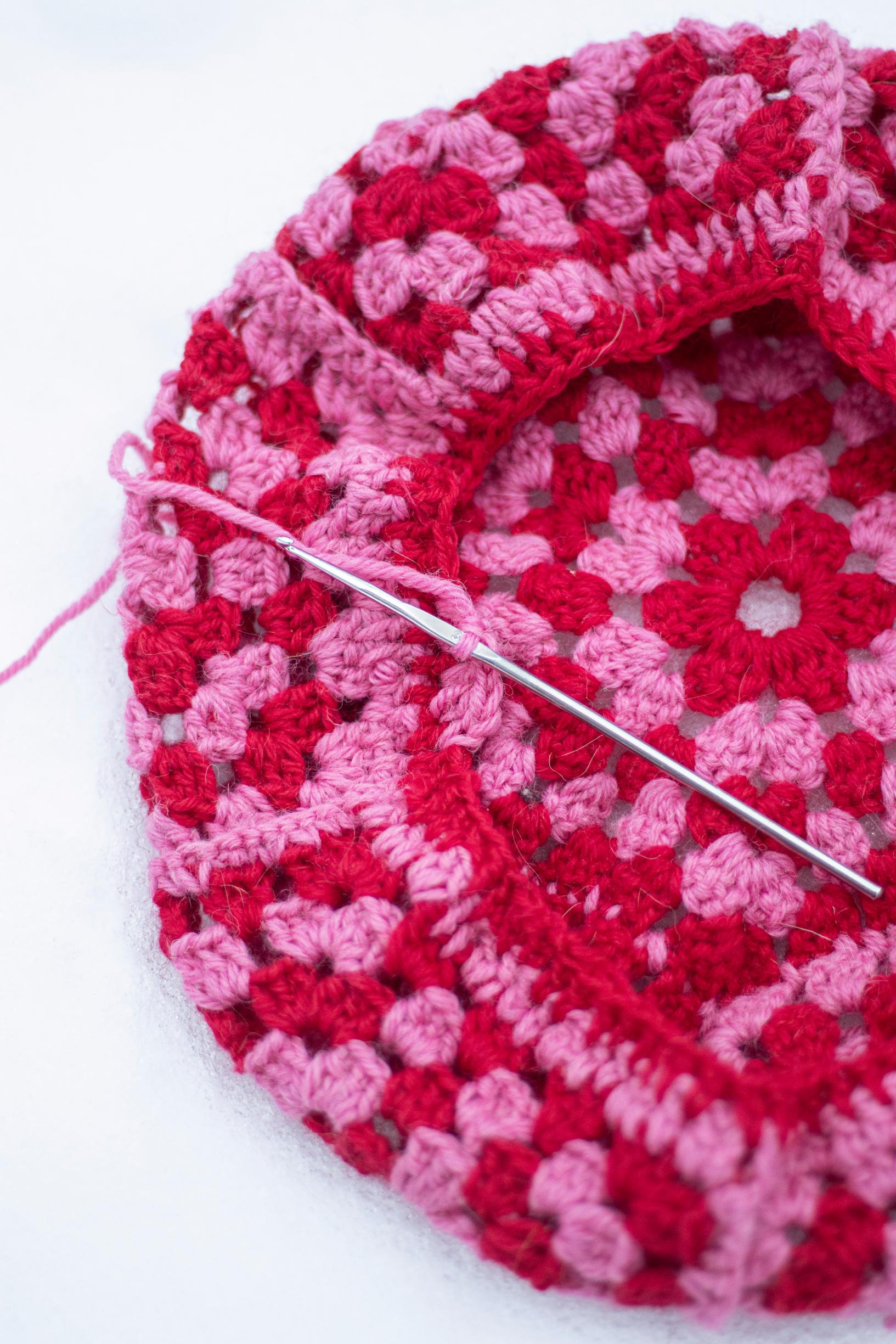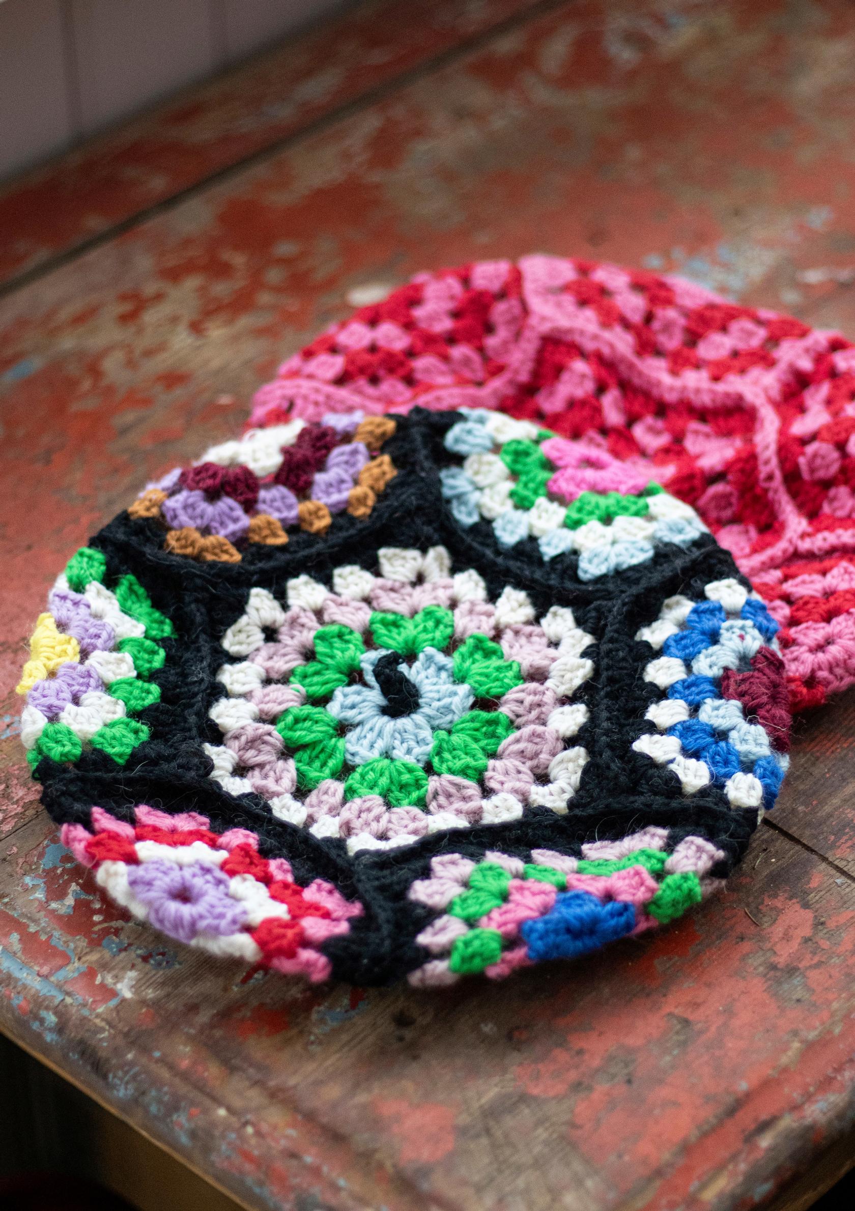 This crocheted beret is assembled from six granny squares and one hexagonal motif—perfect for using up the odds and ends in your yarn basket.