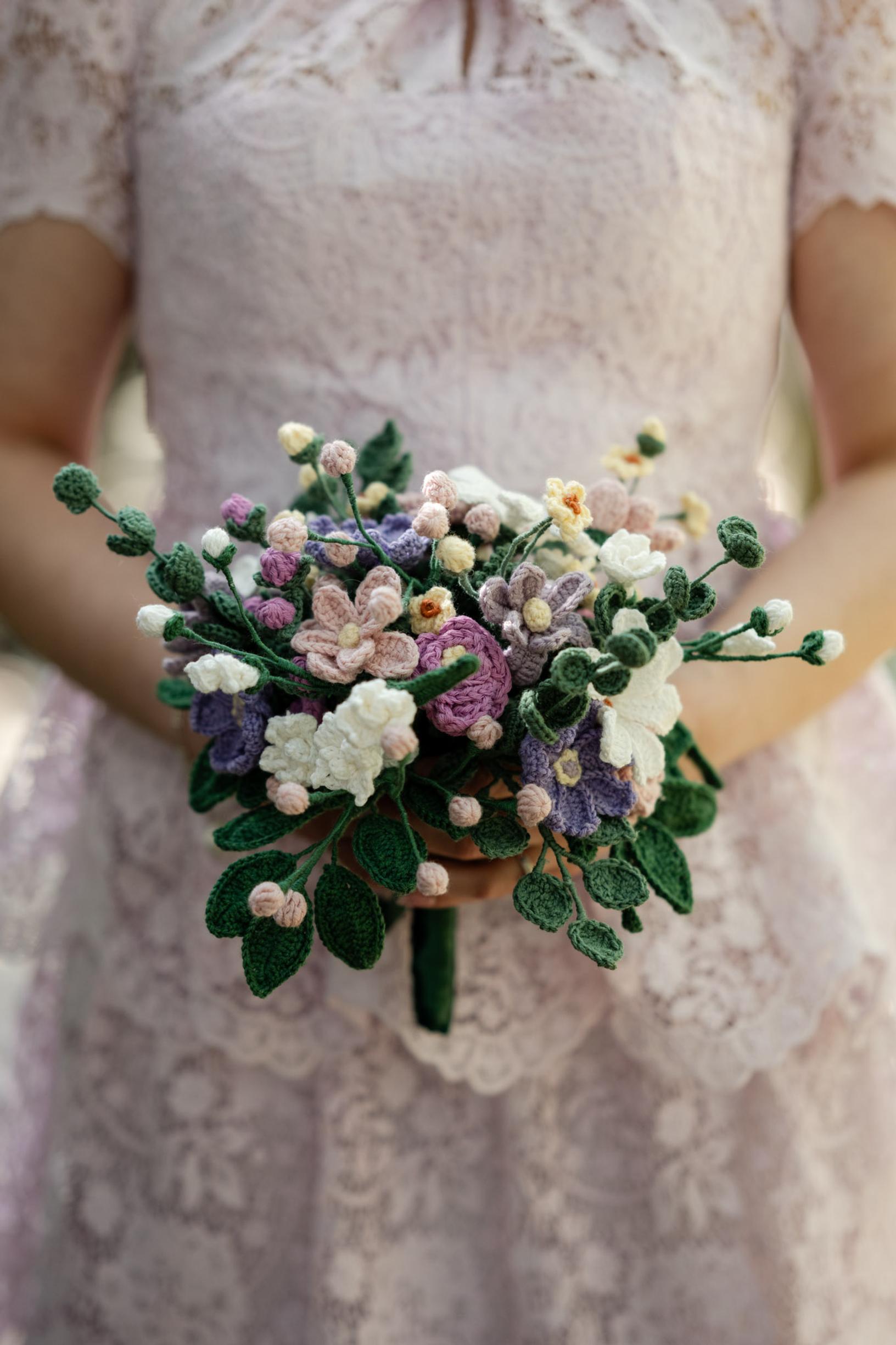 The bouquet truly got to shine on the wedding day beside the pink wedding dress; the colors matched perfectly, even though the dress hadn’t been chosen yet when we selected the yarns. The bouquet received admiration during the celebration. Some guests initially thought the flowers were real—and that was the illusion we wanted to create!