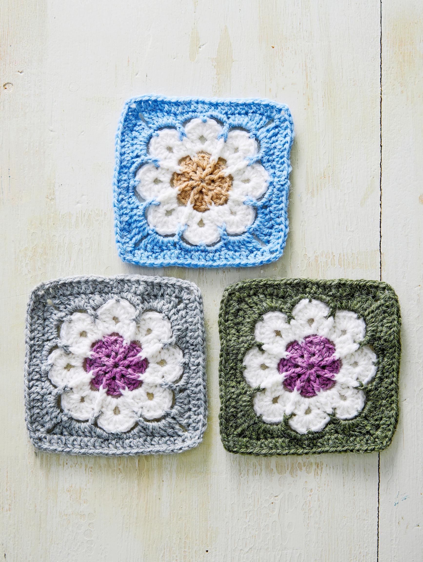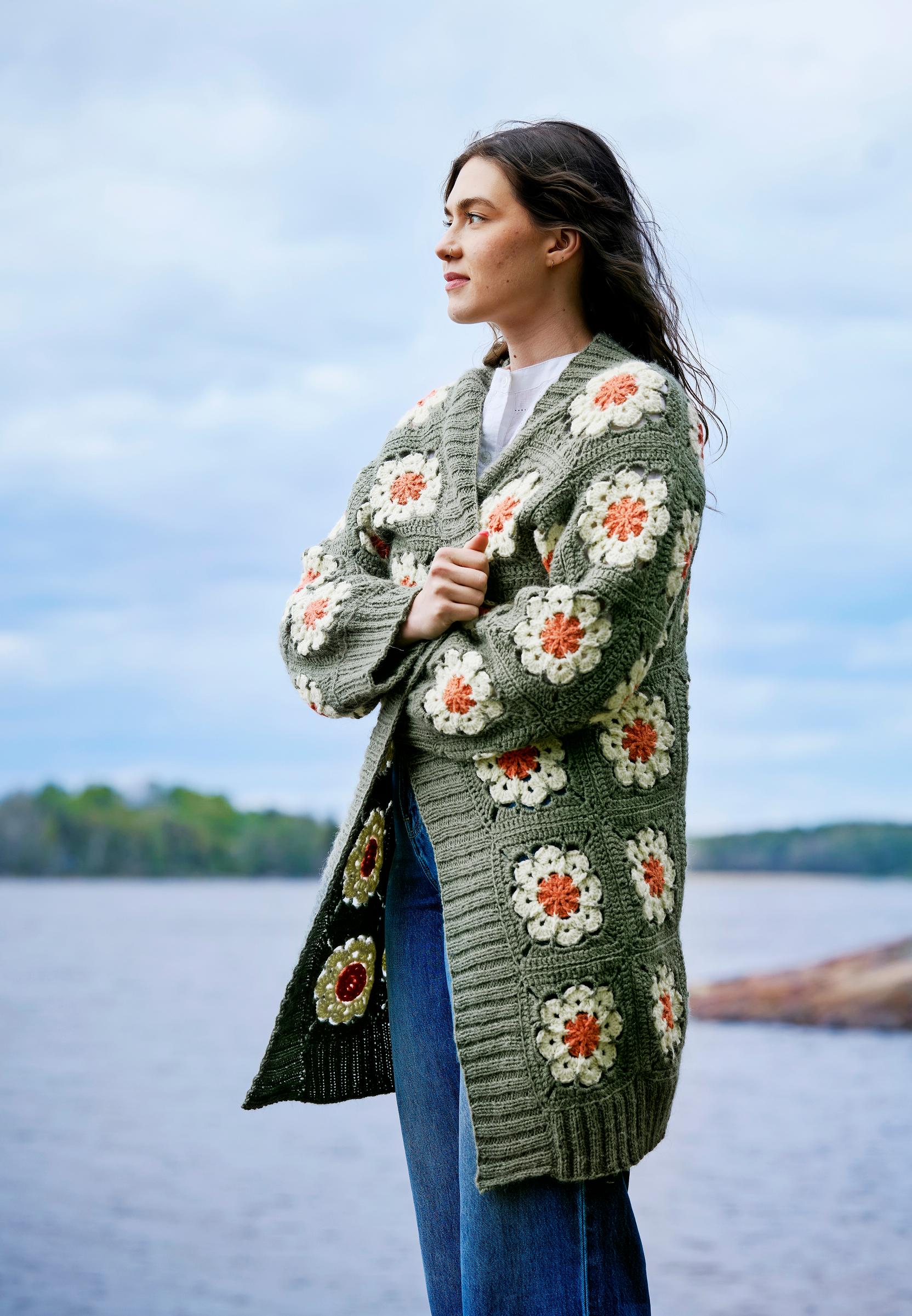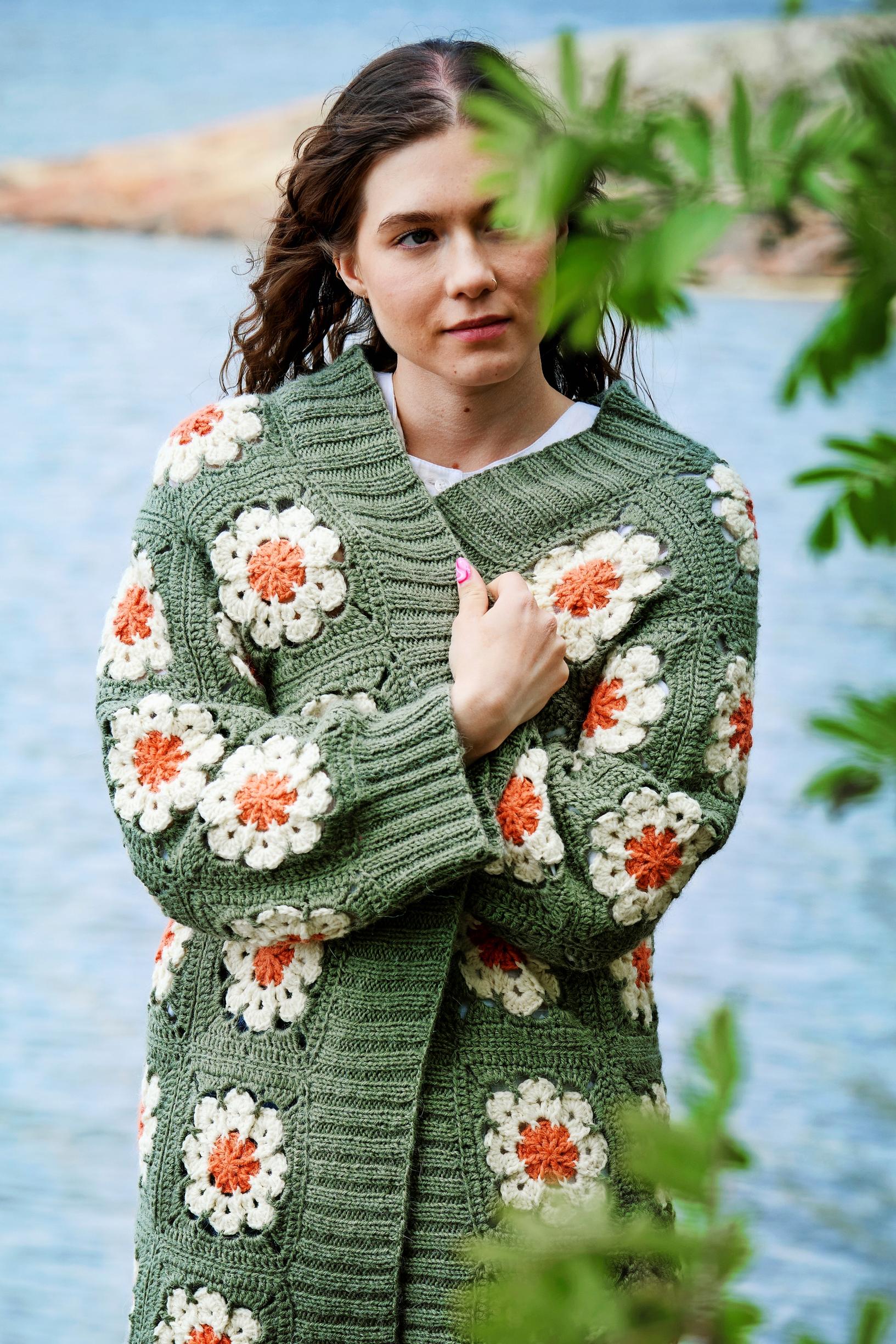 This crocheted flower cardigan is made from squares with a three-dimensional texture created by front post stitches. You can easily adjust the size by adding or removing squares. The cardigan is finished with knitted edges.