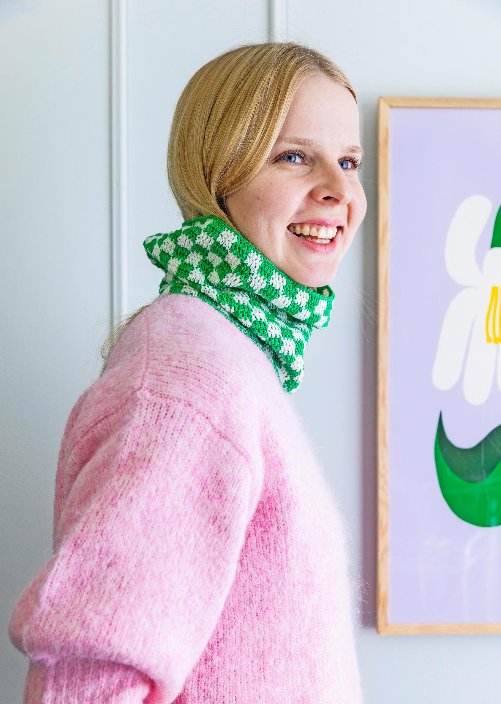 Designed by Minttu Wikberg, this cozy checkerboard cowl is crocheted in the round with a colorwork technique in two colors. The easy crochet project is perfect for using up leftover yarn.
