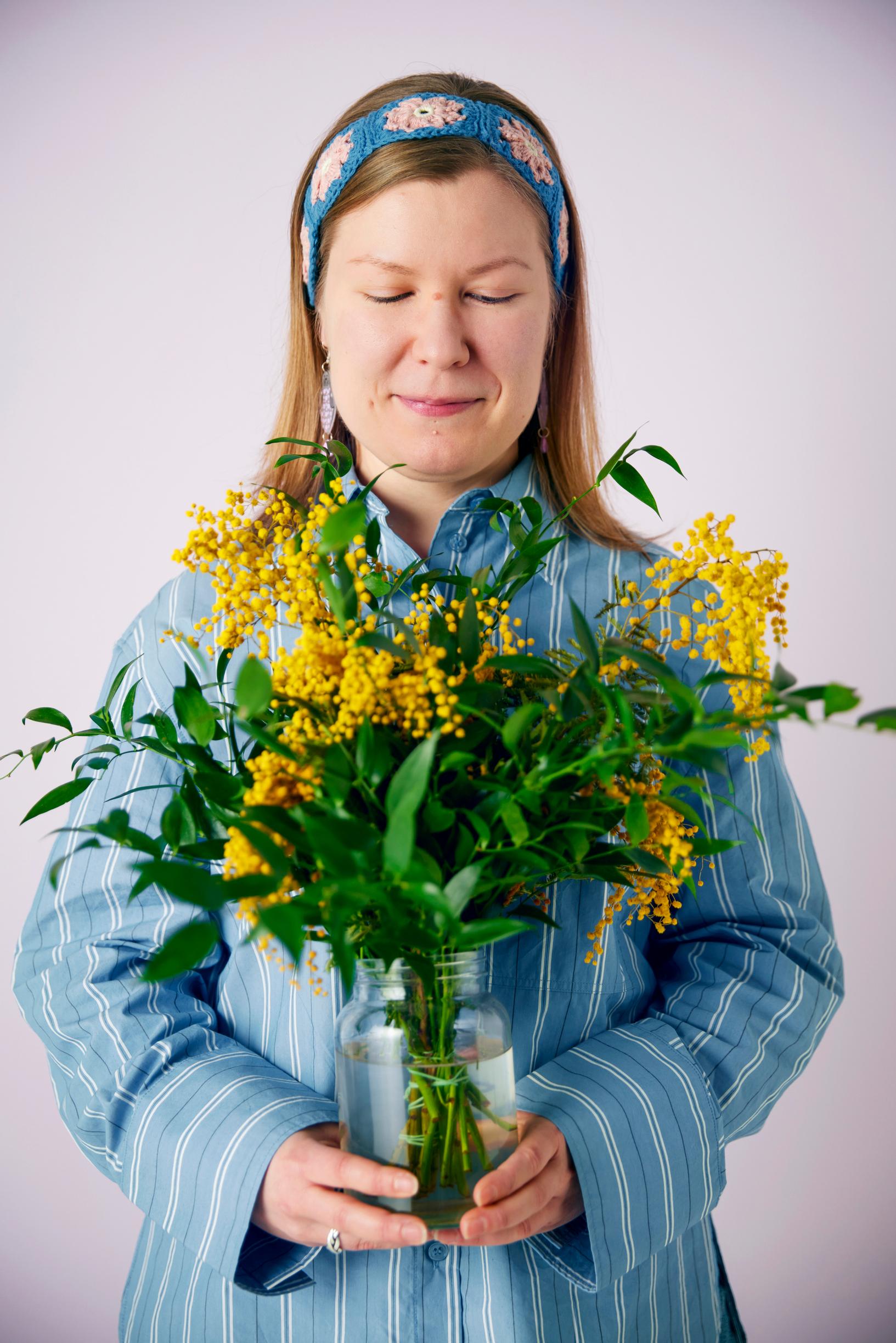 This crocheted headband is made with colorful flower squares that you can easily make from leftover yarn, for instance. The band fits all sizes, as it can be adjusted with tie strings.