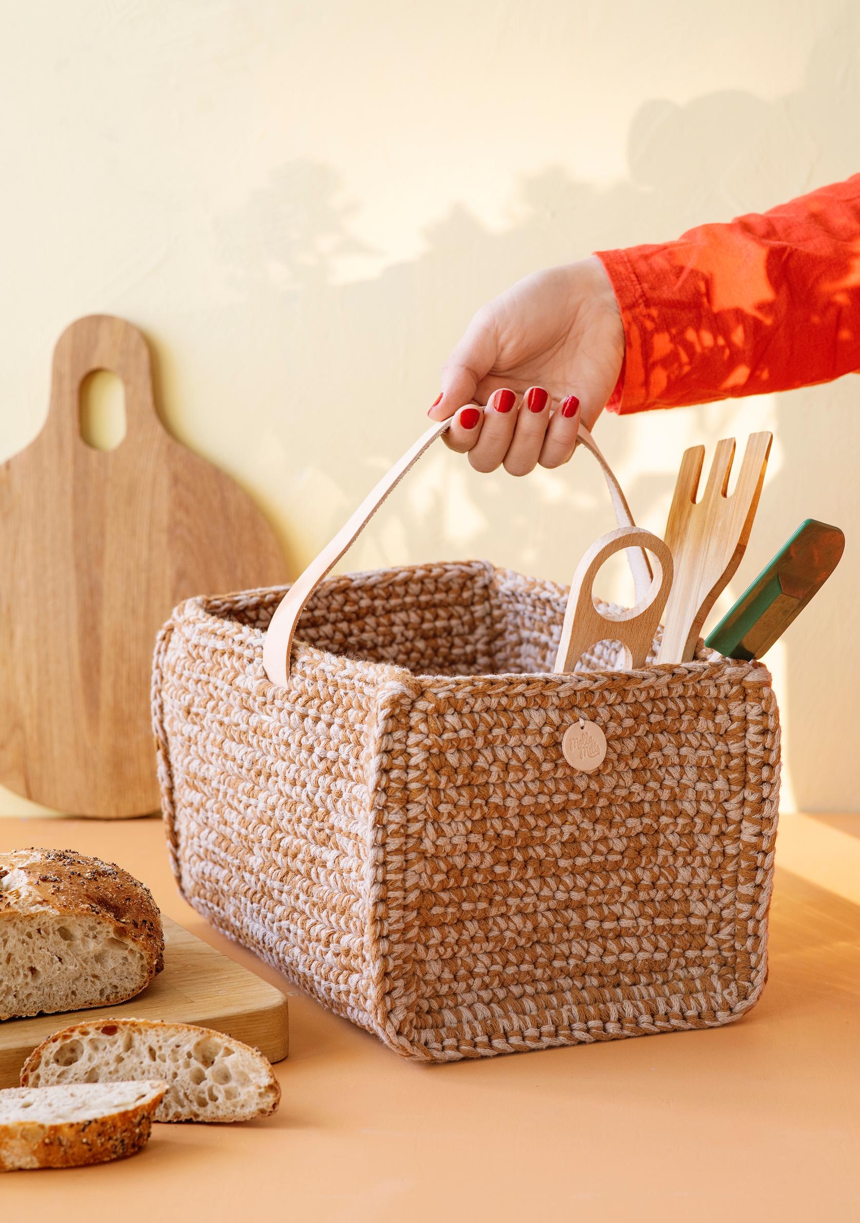 This crocheted mushroom basket is perfect for fall forest outings but also works well at home as a storage basket. Made from separate pieces, it has a sturdy construction that’s easy to complete, and the material can be washed if needed.
