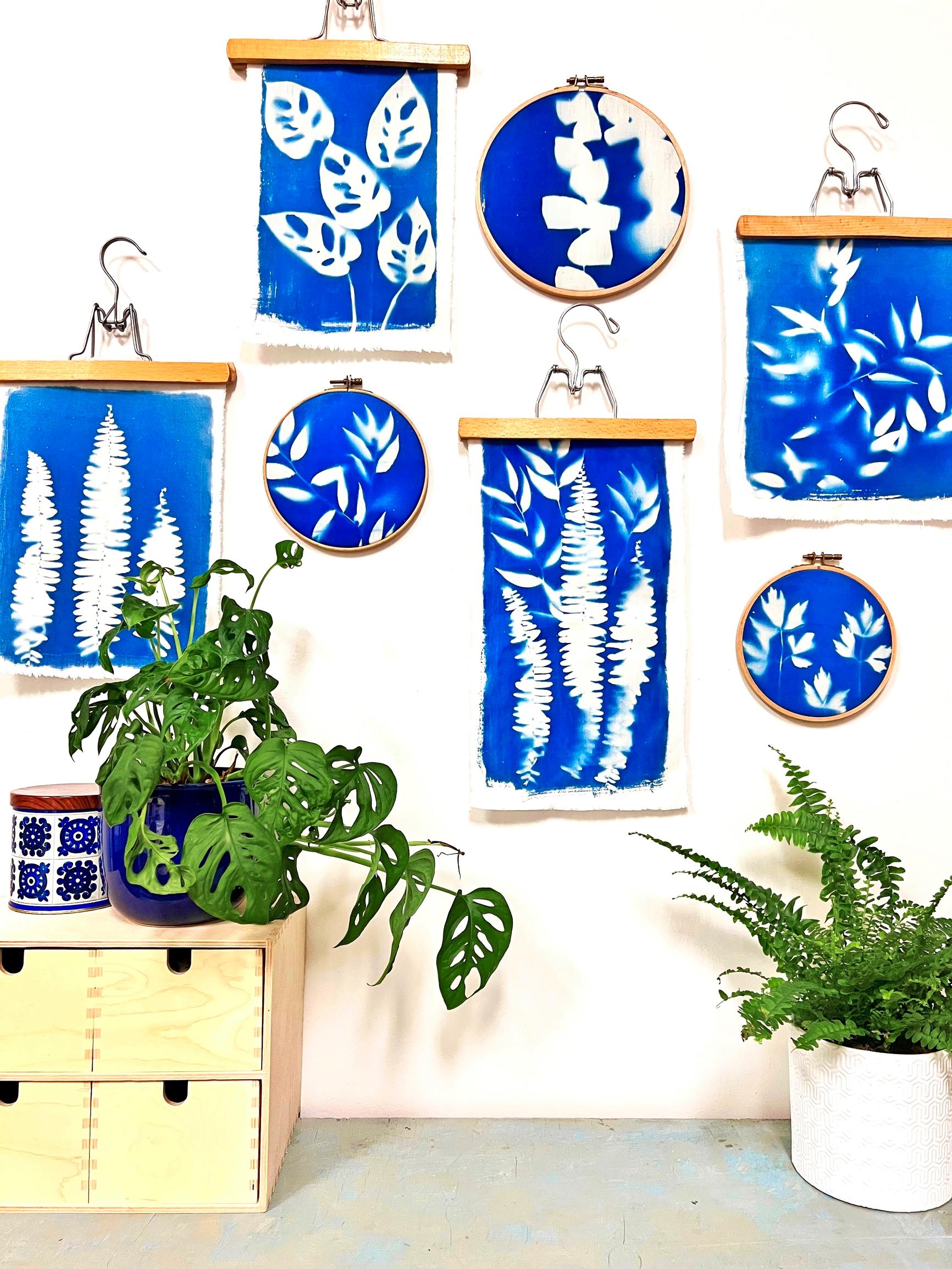 Cyanotype is a printing method in which iron salts are exposed to light, resulting in a bold shade of blue. The areas that do not receive light remain colorless. Pick a sunny day for exposure, and you’ll see results in no time!