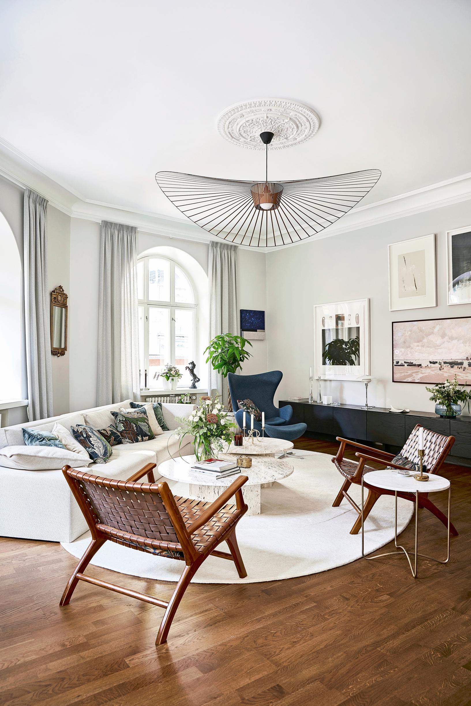 In a large, high-ceilinged living room, adding softness is needed for both acoustics and comfort. Generously pleated straight curtains, the upholstery on the sofa and Egg armchair, throw pillows, and a sufficiently large Layered rug ground the seating group.